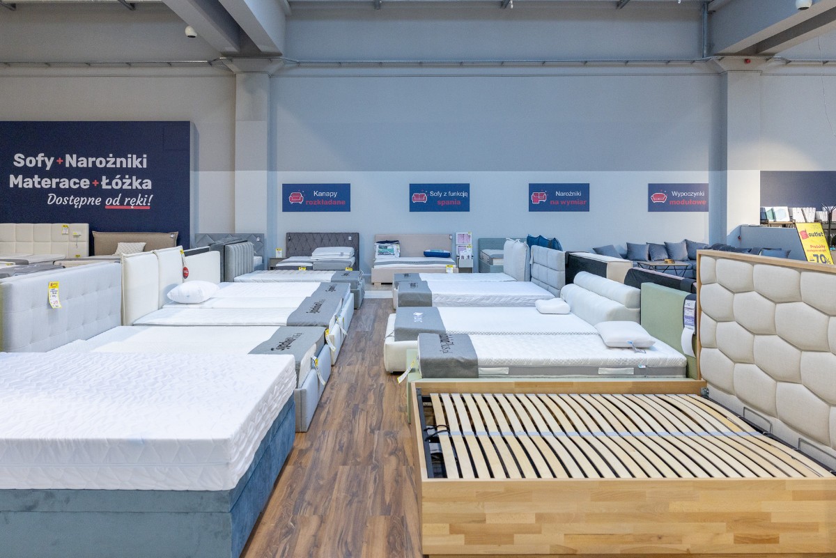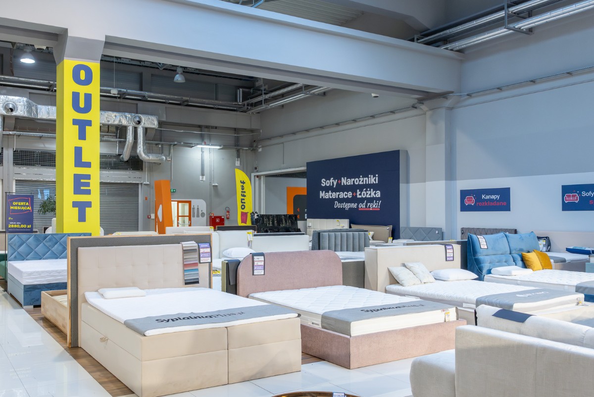 Na ekspozycji outletowej prezentowane są m.in. materace piankowe, sprężynowe oraz hybrydowe, a także materace nawierzchniowe, dostępne w najpopularniejszych rozmiarach od 80x200 do 200x200. Różnorodność modeli pozwala dobrać rozwiązanie dopasowane do indywidualnych potrzeb, preferowanej twardości oraz sposobu użytkowania. W outlecie prezentowane są również łóżka tapicerowane, drewniane i kontynentalne, w tym modele z pojemnikiem na pościel, a także poduszki i akcesoria do komfortowego snu, które pozwalają kompleksowo wyposażyć sypialnię w jednym miejscu.