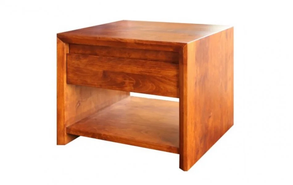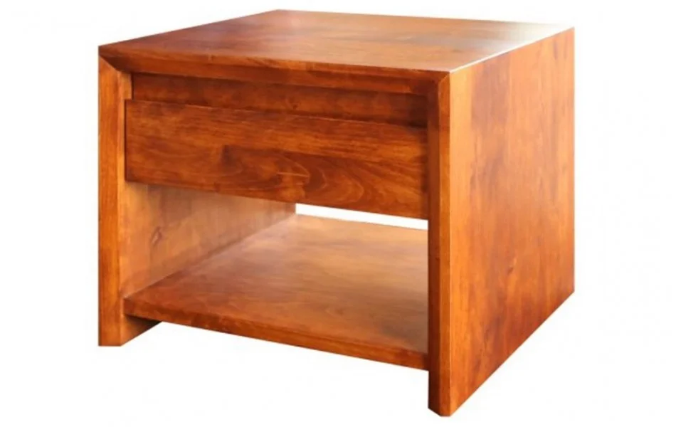 Drewniana szafka nocna M-Form wykonana jest z litego drewna olchowego lub dębowego. Oprócz rodzaju drewna wybierzesz też kolor wybarwienia, dzięki czemu bez problemu dopasujesz ten mebel do Twojej sypialni. Wolnostojąca szafka nocna wyposażona jest w półkę i szufladę, zamontowaną na prowadnicach kulkowych z cichym domykiem. Front szuflady posiada frezowany uchwyt.