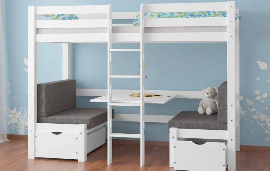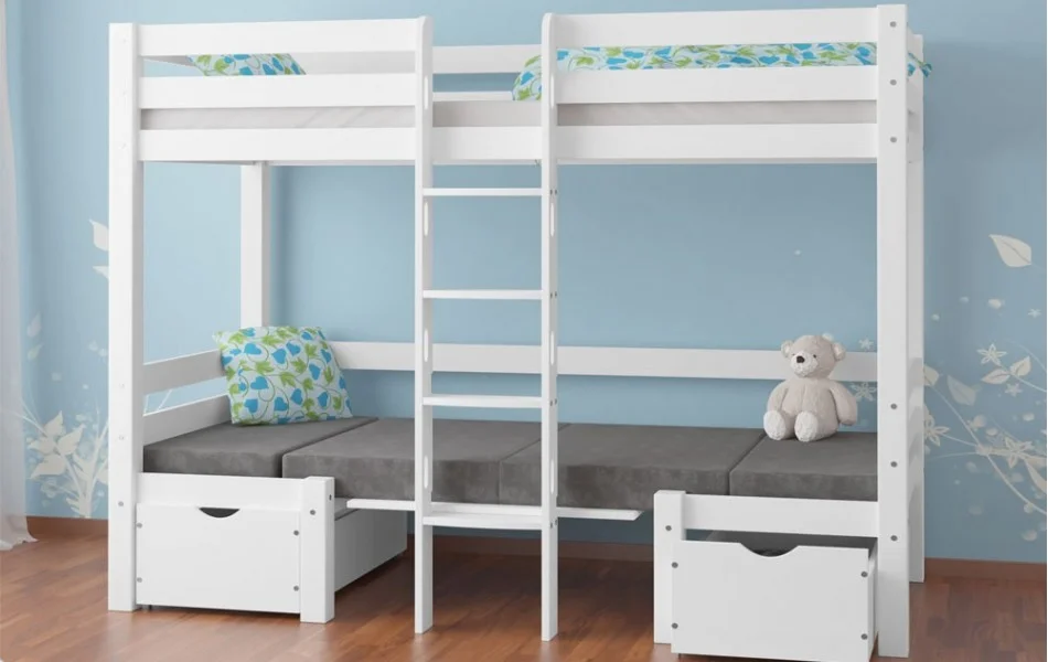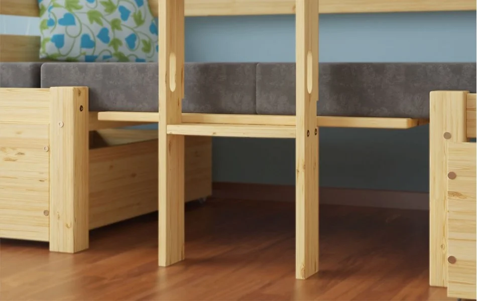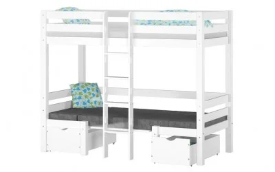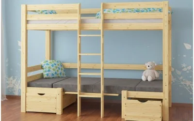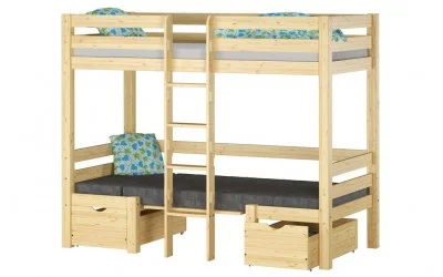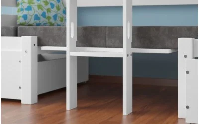 Montreal to łóżko piętrowe zrobione z drewna sosnowego, które ma unikalne zastosowanie dolnej części, która się składa i może być użyta jako stolik do nauki lub zabawy. To wygodne rozwiązanie w pokoju dziecięcym, które pozwala zaoszczędzić miejsce i nie wymaga dodatkowego mebla.