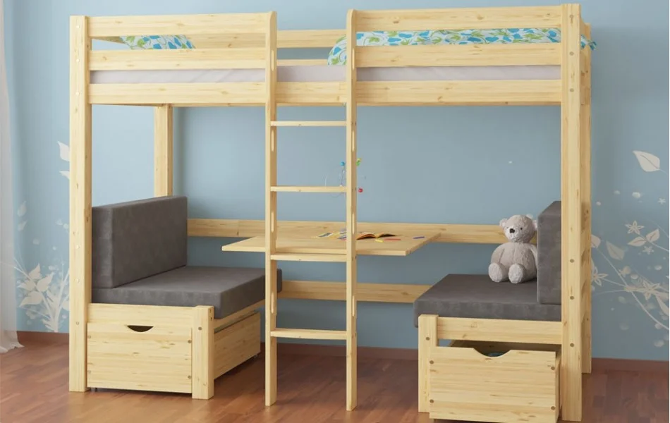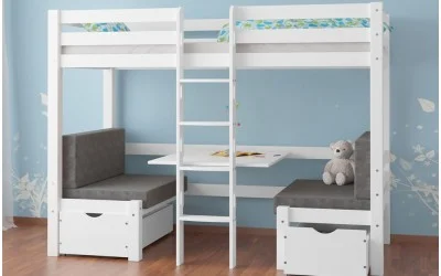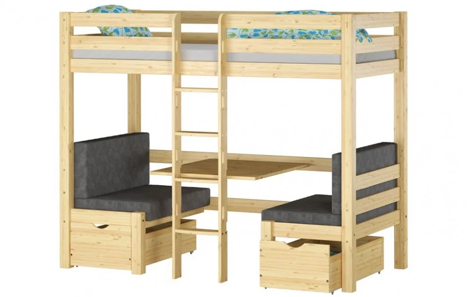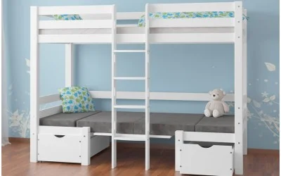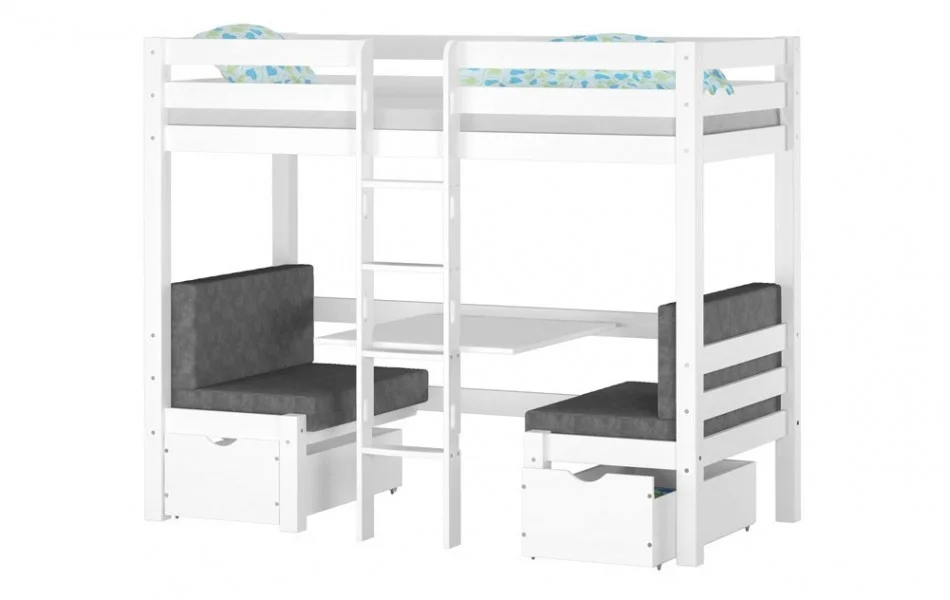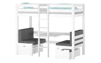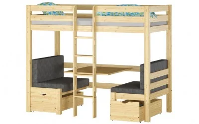 Łóżko piętrowe Montreal od Senpuro Teak to nietuzinkowa propozycja dla dzieci, która wyróżnia się nie tylko wygodnym miejscem do spania, ale również funkcjonalnością w ciągu dnia. Mebel wykonany jest z trwałego drewna sosnowego i dostępny w naturalnym kolorze lub bieli. Łóżko składa się z dwóch poziomów połączonych drabinką, które mogą służyć do spania. Część dolna łóżka jest składana w kilku ruchach, tworząc wygodne miejsce do nauki lub zabawy, z dwoma siedzeniami i stołem między nimi. Powierzchnie spania to 90x200 cm, a wymiary całej konstrukcji to tylko 99x209 cm, dzięki czemu jest to idealne rozwiązanie dla niewielkich pokoi dziecięcych. Siedziska łóżka Elen są dostępne w kolorze szarym.