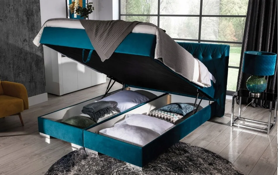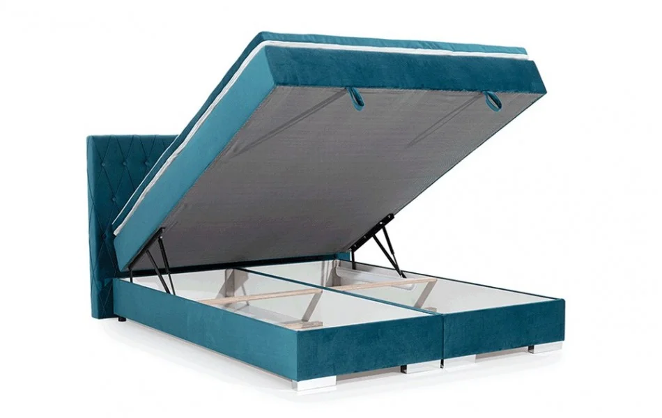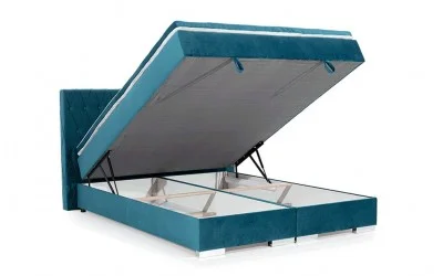 Łóżko kontynentalne Filip 3 wyposażone jest w pojemnik na pościel, zamocowany na siłownikach gazowych. Dzięki temu masz zapewniony łatwy dostęp do pojemnika i bez problemu uniesiesz stelaż z materacem. Antypoślizgowy materiał sprawia, że materac nie przesuwa się na łóżku.