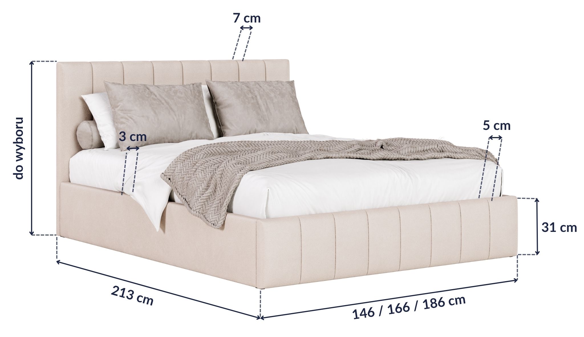 ● długość: 213 cm, szerokość: 146 cm, powierzchnia spania: 140x200 cm,