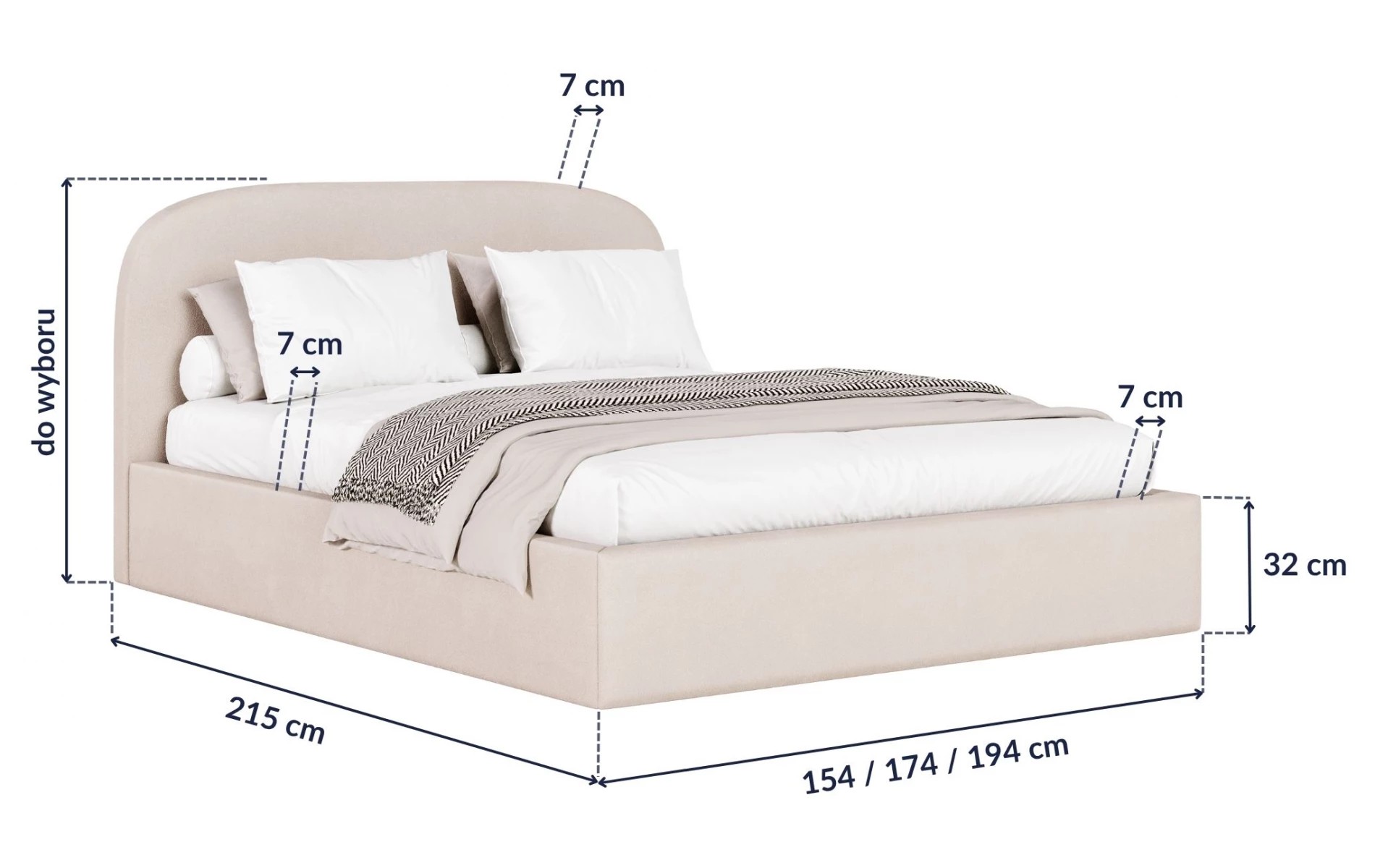 Na grafice znajdziesz kluczowe wymiary modelu: szerokość całkowitą w zależności od wybranego wariantu, wysokość i szerokość ramy oraz grubość wezgłowia. Dzięki temu łatwiej zaplanujesz przestrzeń w swojej sypialni i zyskasz pewność, że łóżko nie tylko świetnie wygląda i zapewnia wysoki komfort snu, ale również pozostawia wygodne przejścia i komfort użytkowania na co dzień.