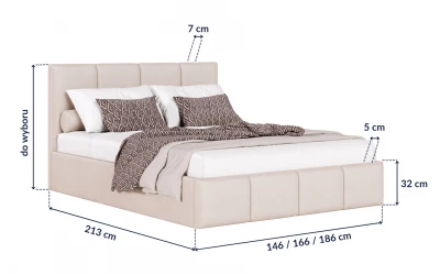 Na grafice znajdziesz kluczowe wymiary modelu: szerokość całkowitą w zależności od wybranego wariantu, wysokość i szerokość ramy oraz grubość wezgłowia. Dzięki temu łatwiej zaplanujesz przestrzeń w swojej sypialni i zyskasz pewność, że łóżko nie tylko świetnie wygląda i zapewnia wysoki komfort snu, ale również pozostawia wygodne przejścia i komfort użytkowania na co dzień.
