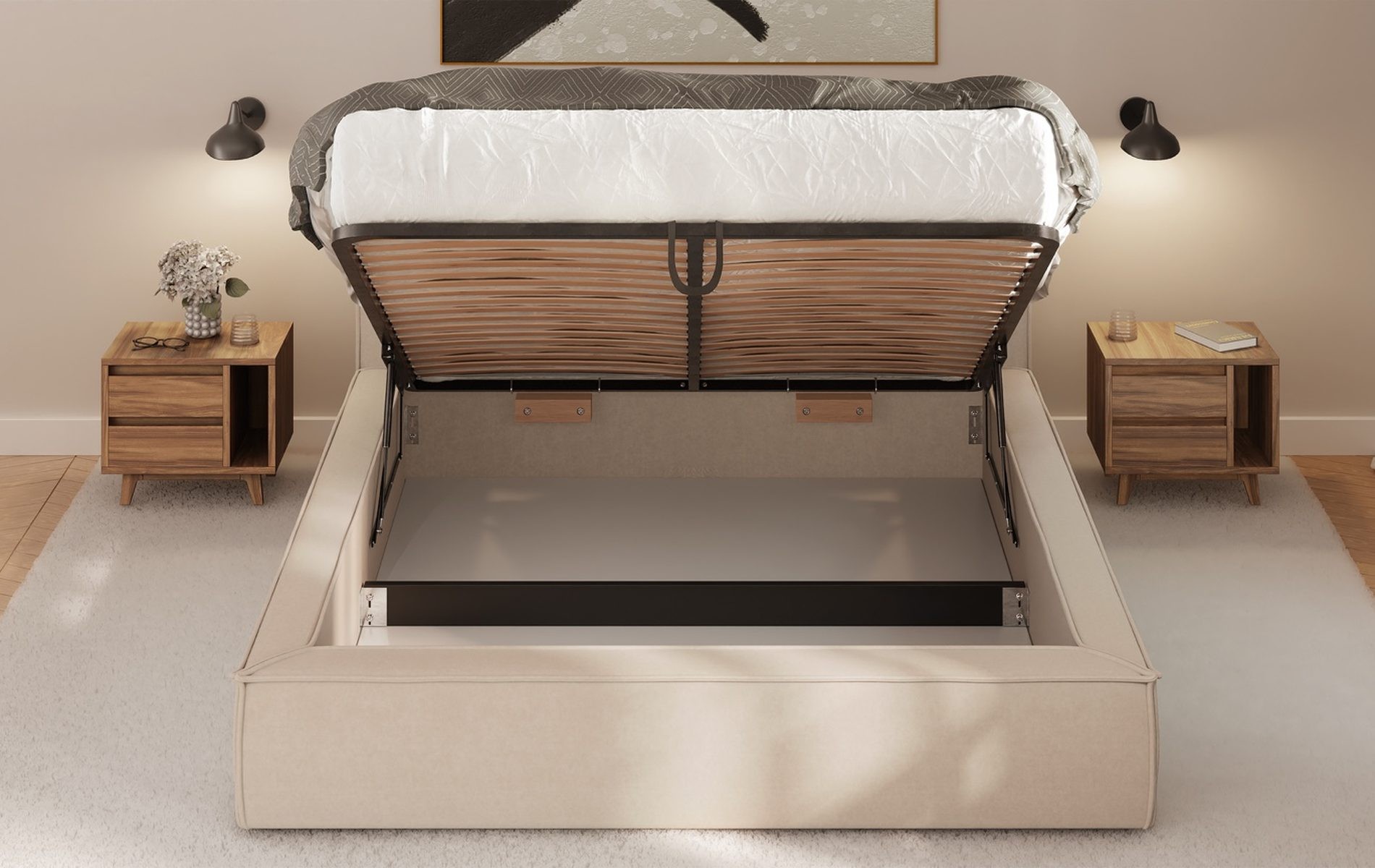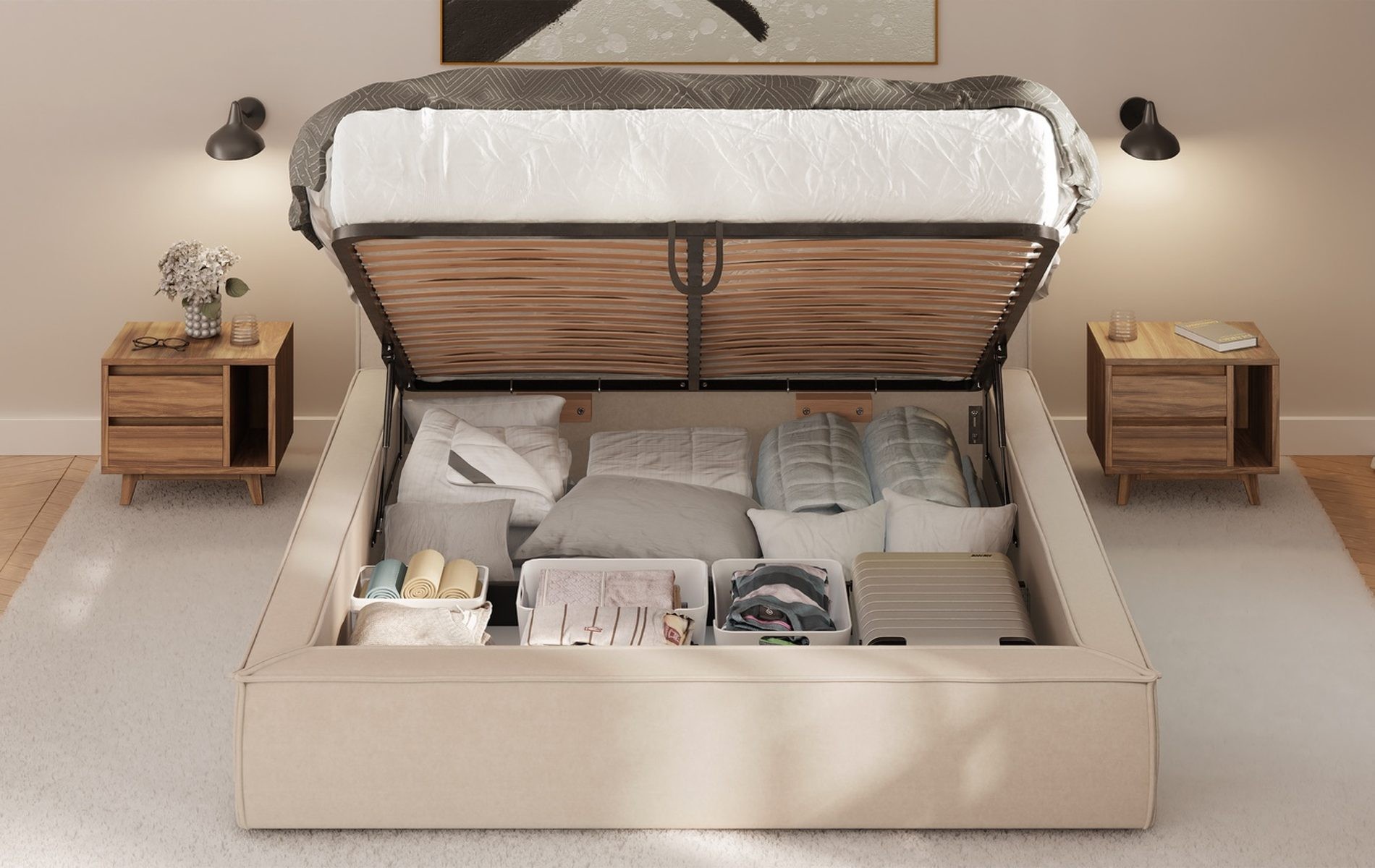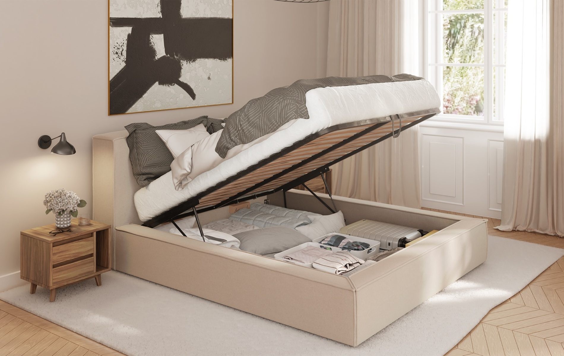 Więcej miejsca bez dodatkowych mebli. Pojemnik pod łóżkiem pozwala trzymać kołdry, poduszki i sezonowe tekstylia „pod ręką”, a sypialnia wygląda po prostu czyściej i spokojniej.