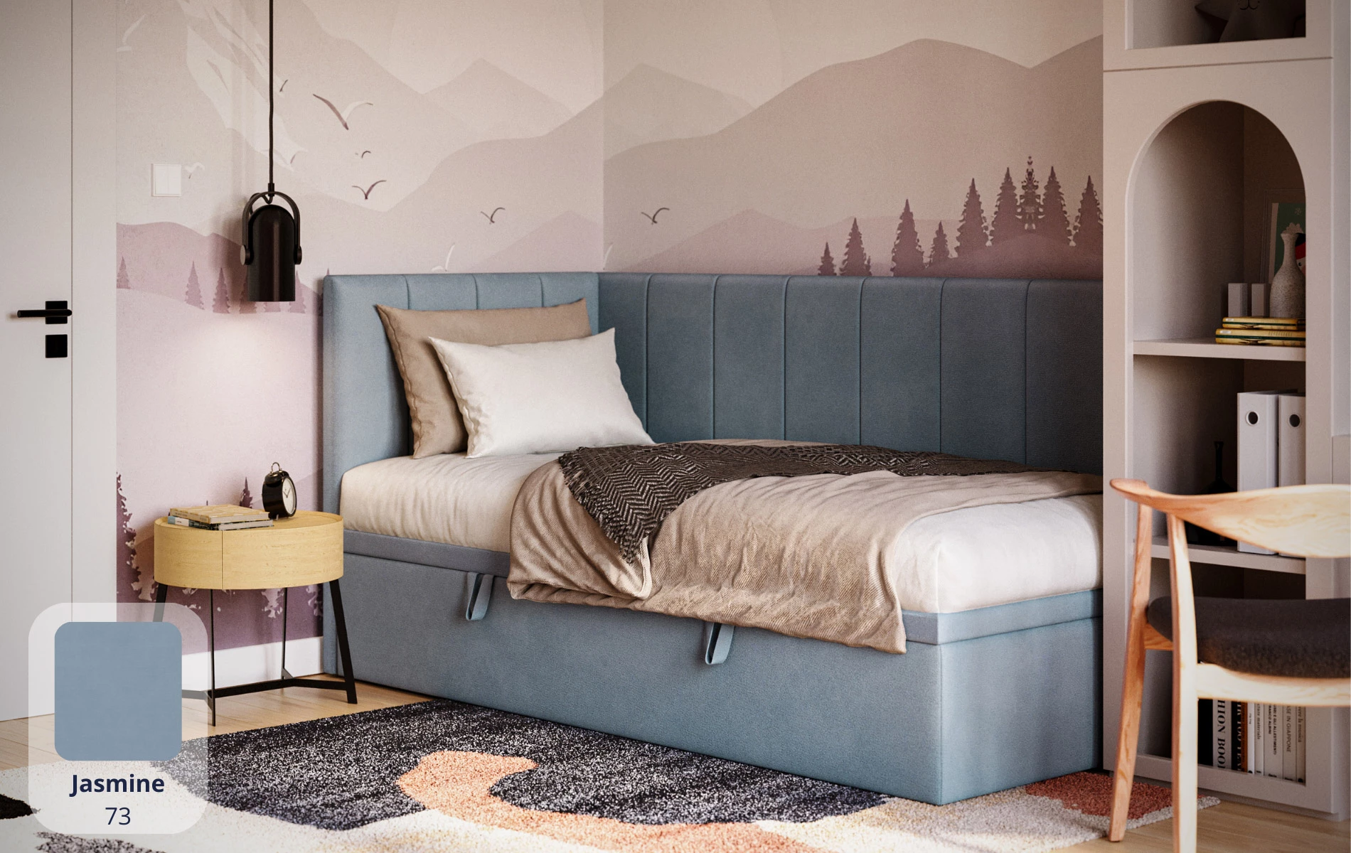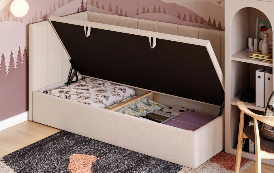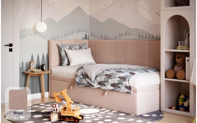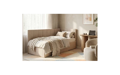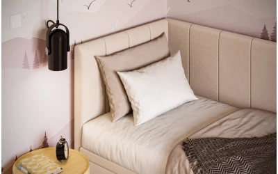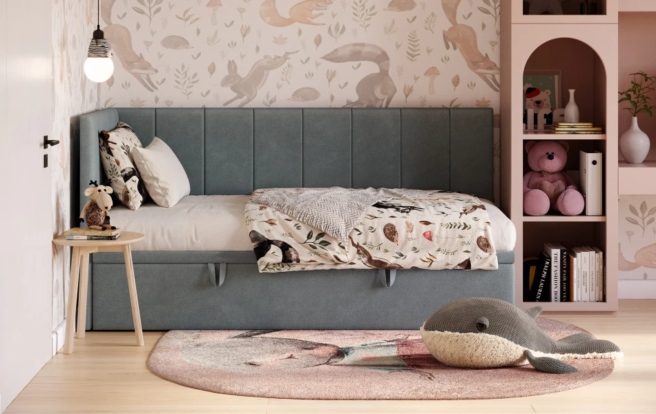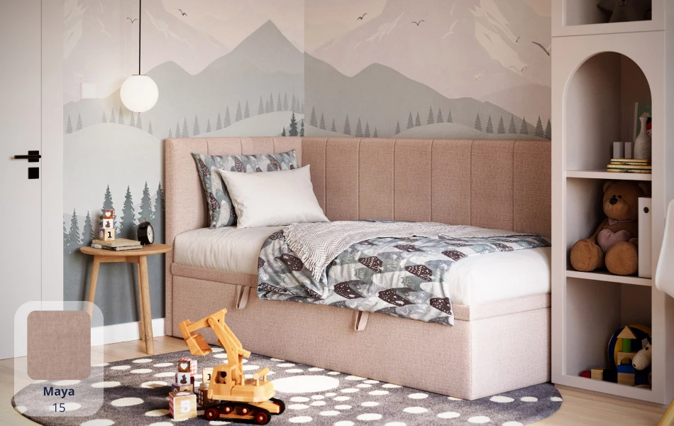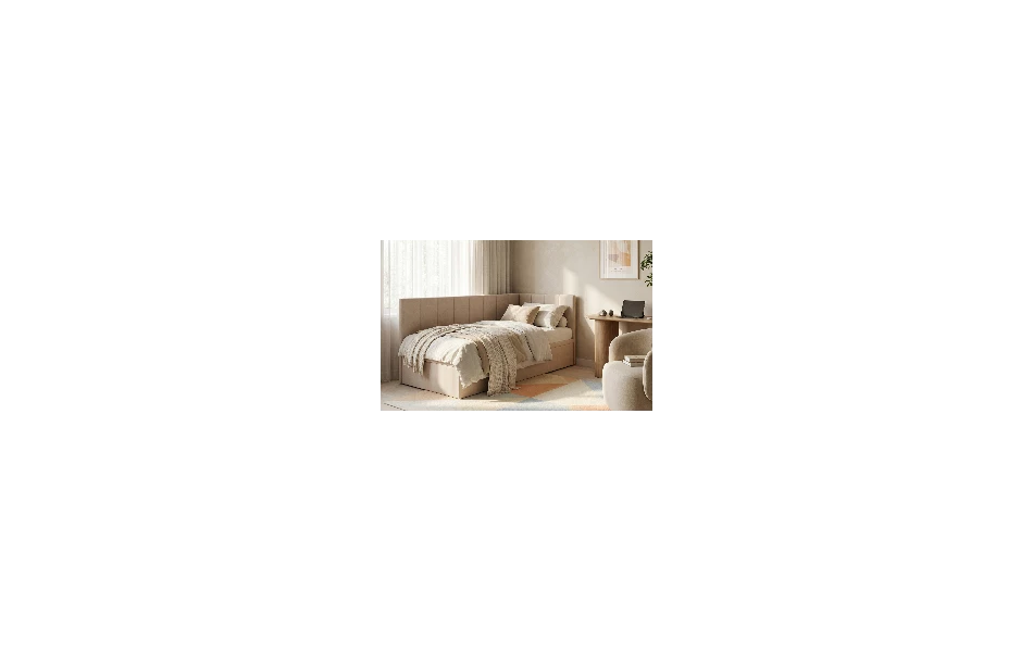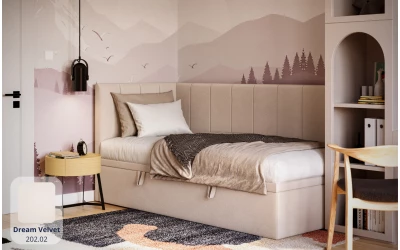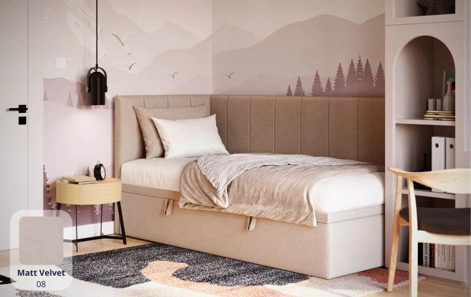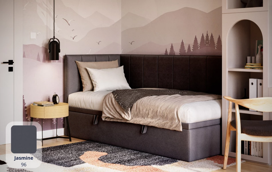 AURORA to praktyczne łóżko jednoosobowe, które pomaga „domknąć” strefę snu w pokoju. Narożne wezgłowie daje wygodne oparcie (czytanie, odpoczynek), a pojemnik pod łóżkiem od razu robi porządek – bez dokładania kolejnych mebli.