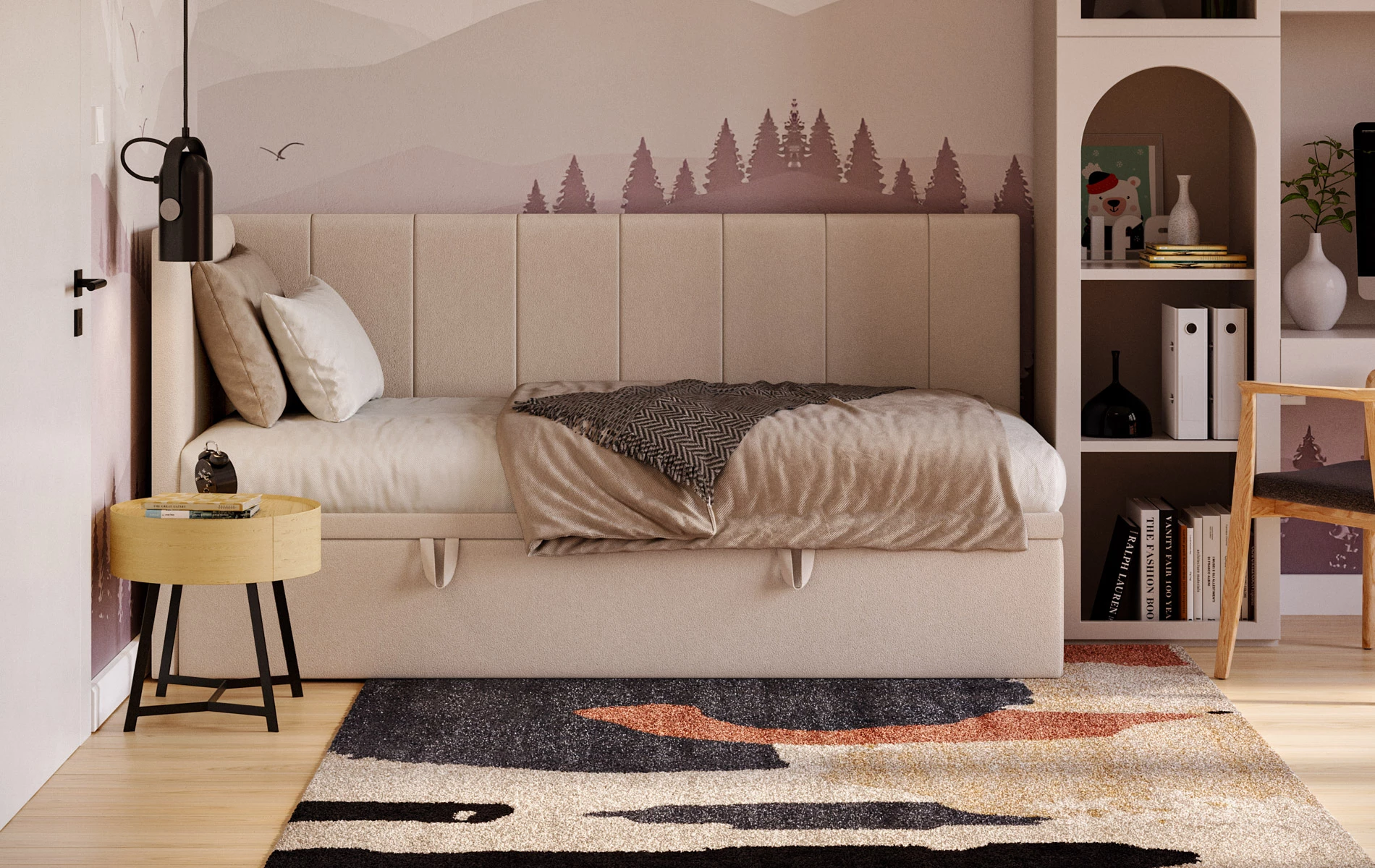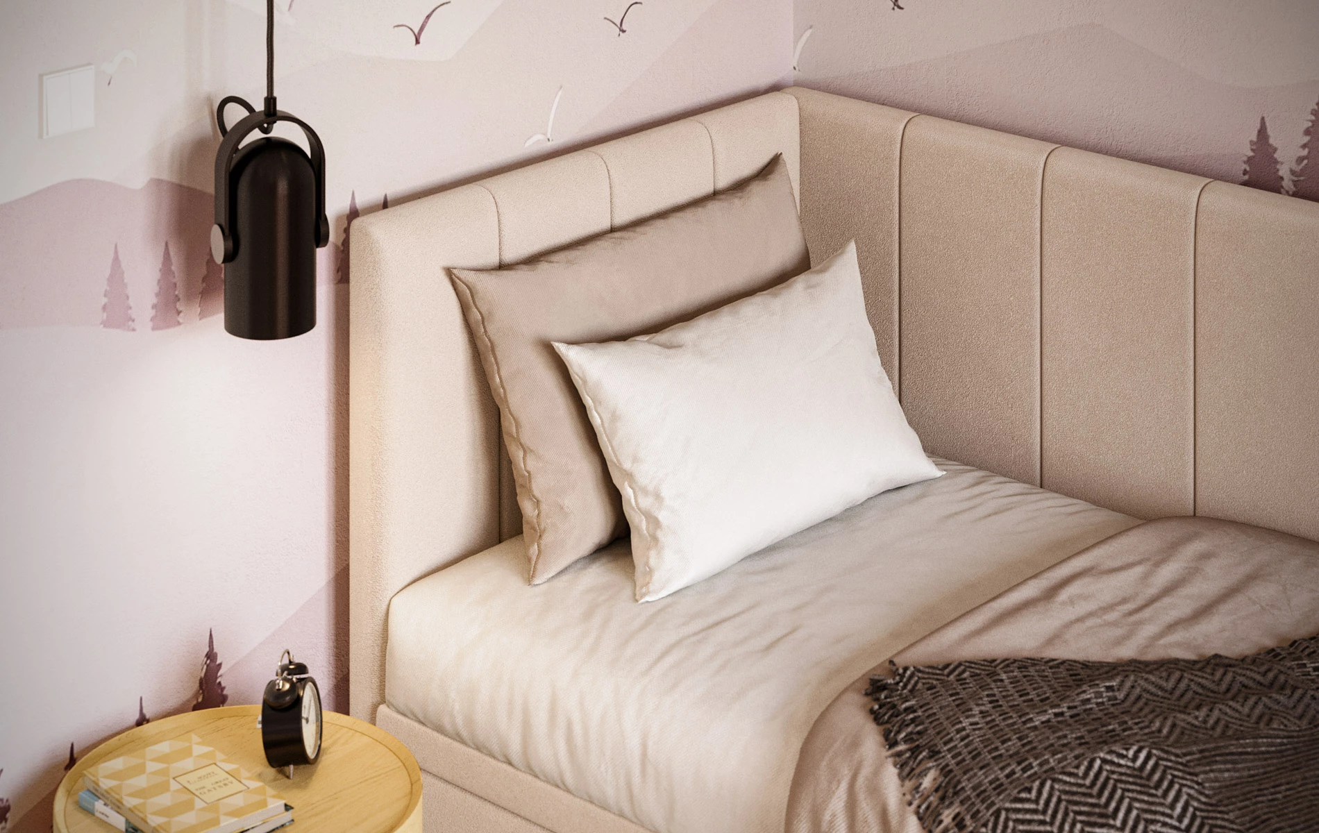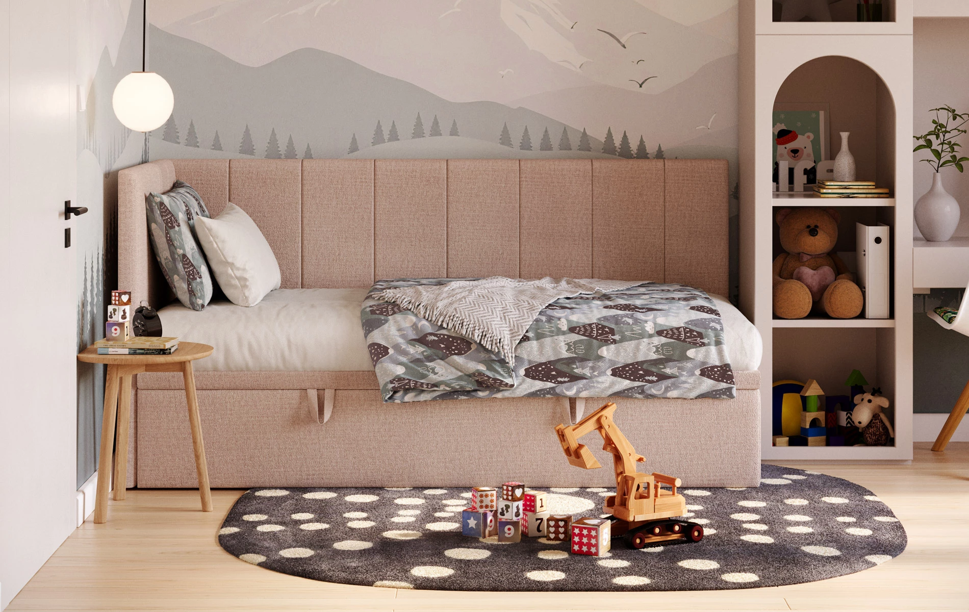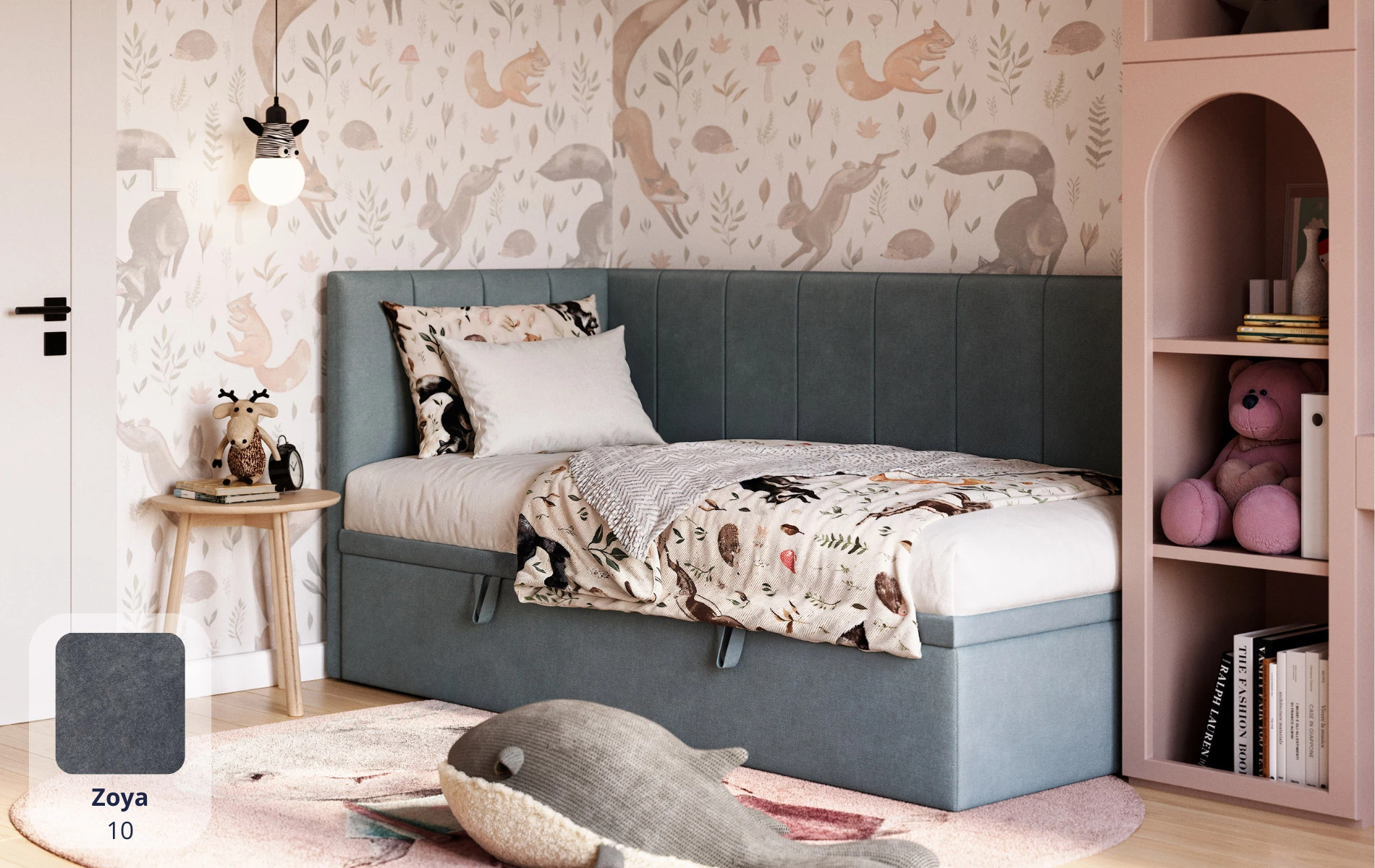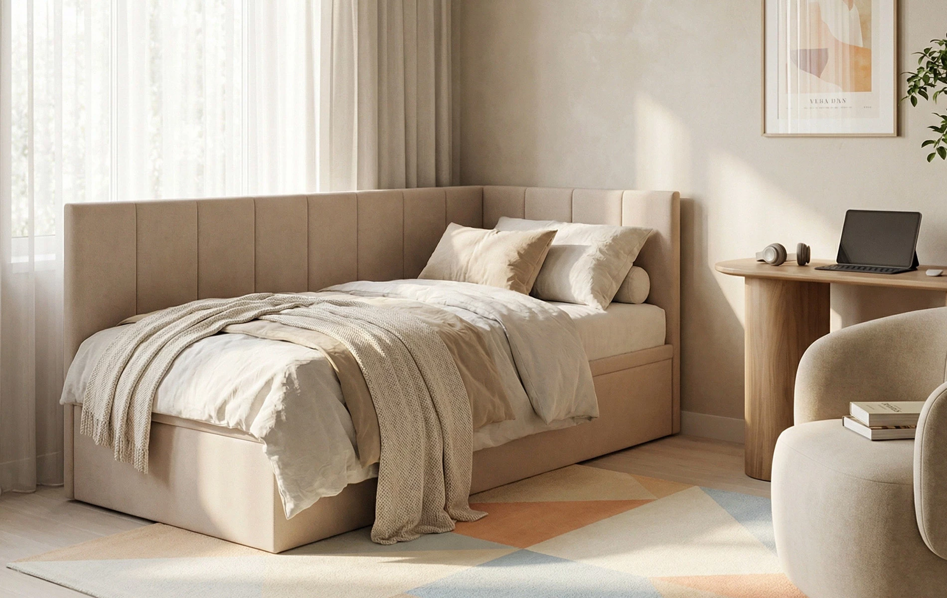 AURORA to praktyczne łóżko jednoosobowe, które pomaga „domknąć” strefę snu w pokoju. Narożne wezgłowie daje wygodne oparcie (czytanie, odpoczynek), a pojemnik pod łóżkiem od razu robi porządek – bez dokładania kolejnych mebli.