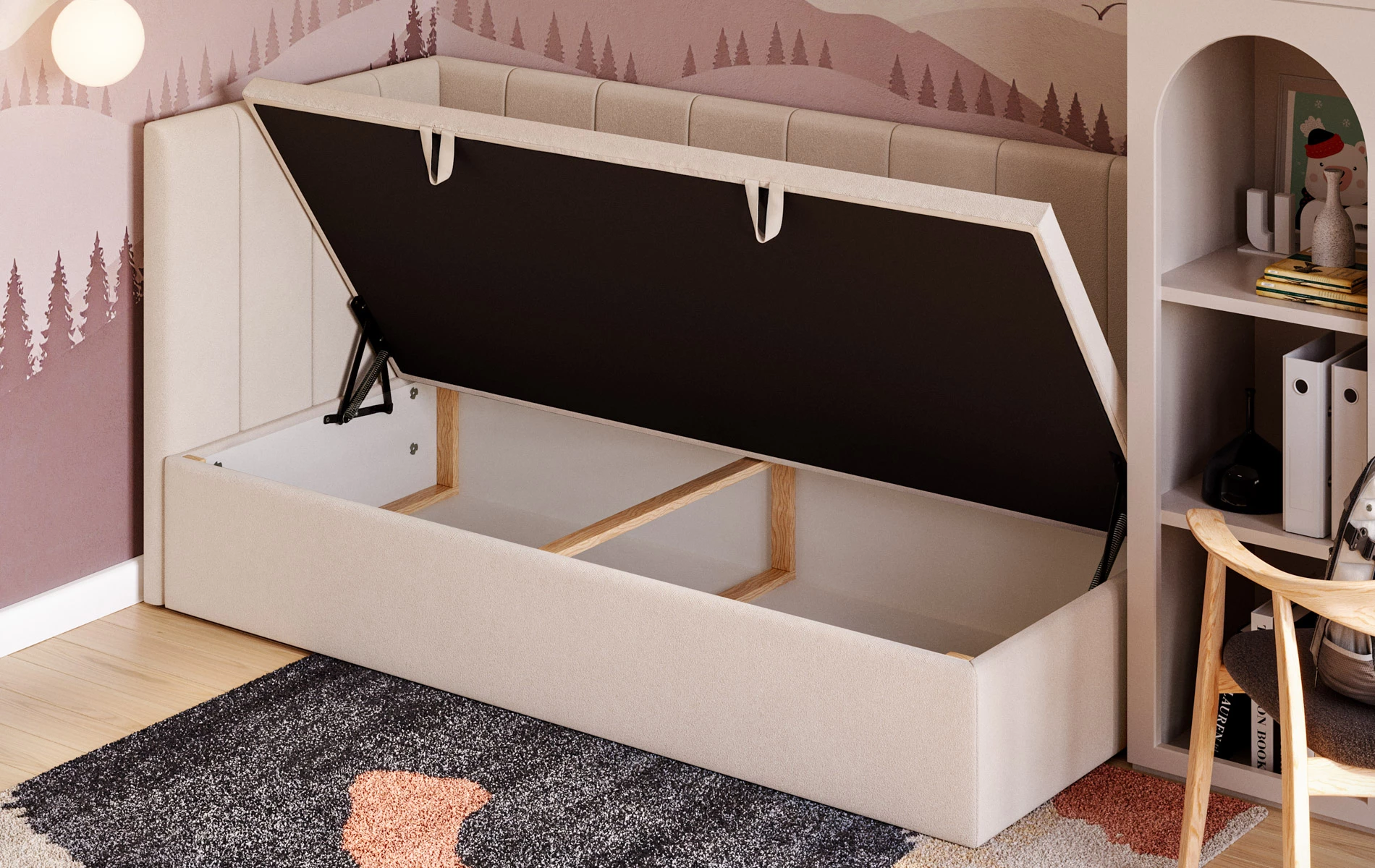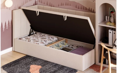 Wygodna obsługa na co dzień. Otwieranie pojemnika jest wspomagane siłownikami sprężynowymi, co ułatwia dostęp do wnętrza i sprawia, że korzystanie z łóżka jest komfortowe również przy codziennym użytkowaniu.