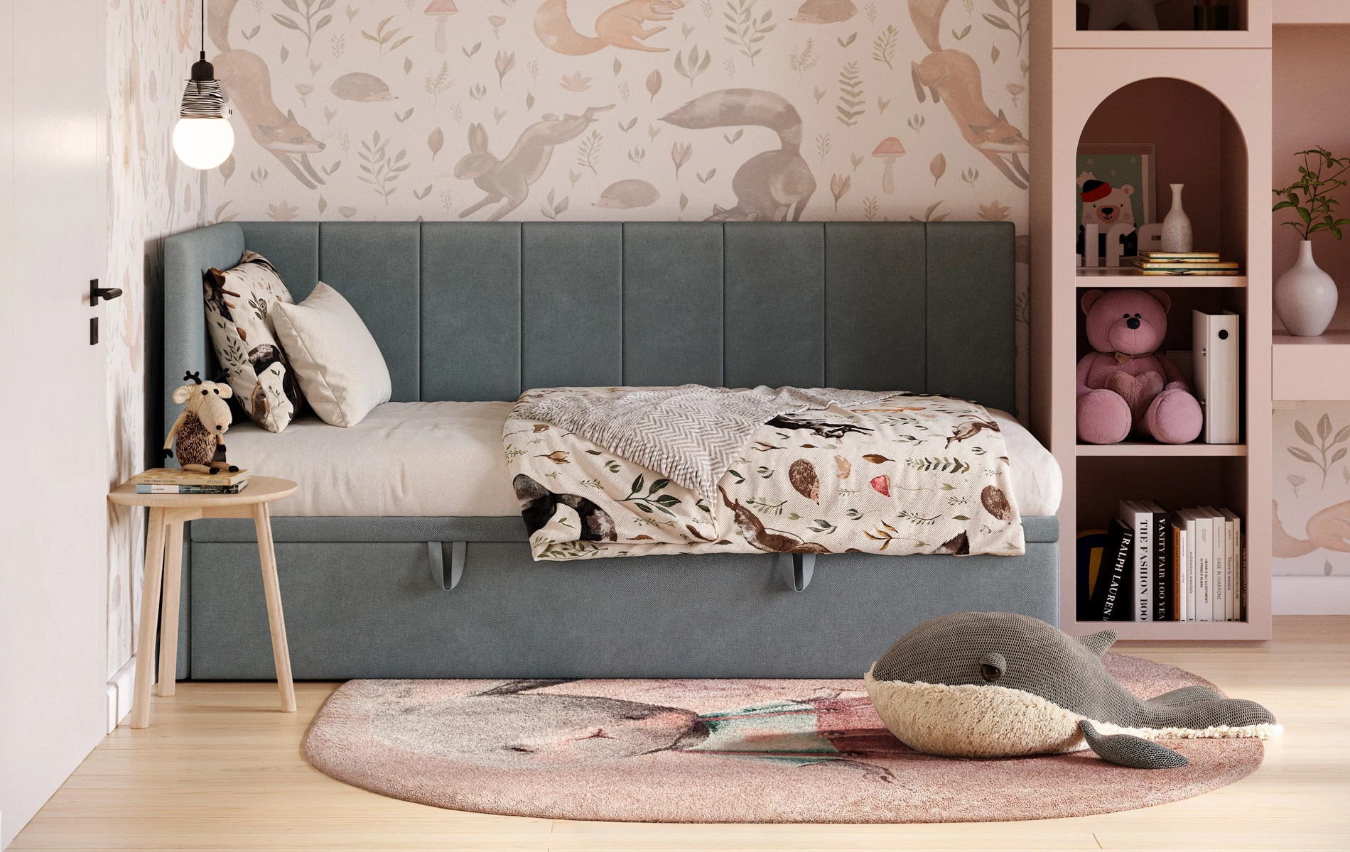 Więcej miejsca bez dodatkowych mebli. Pojemnik pod łóżkiem pozwala przechowywać kołdry, poduszki oraz sezonowe tekstylia w jednym miejscu, dzięki czemu pokój wygląda czyściej i bardziej uporządkowanie.