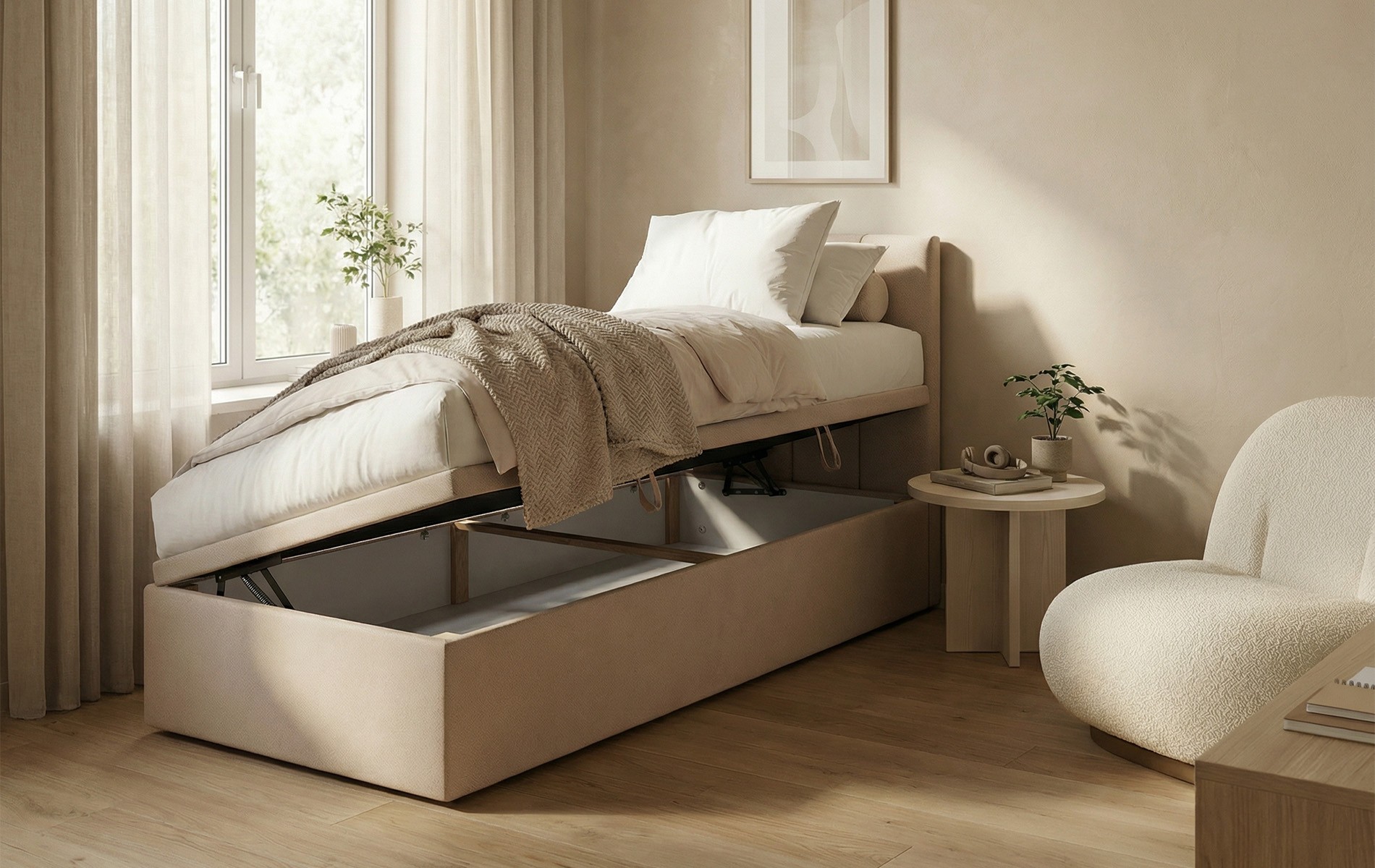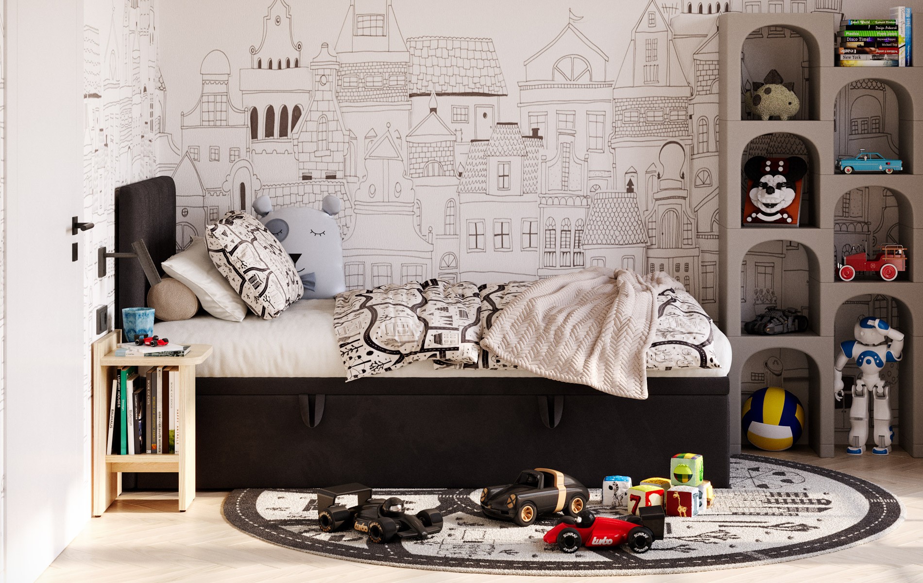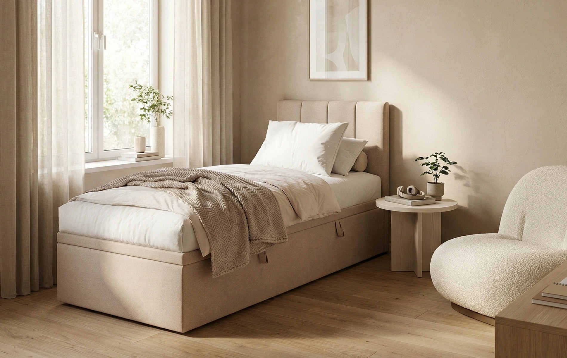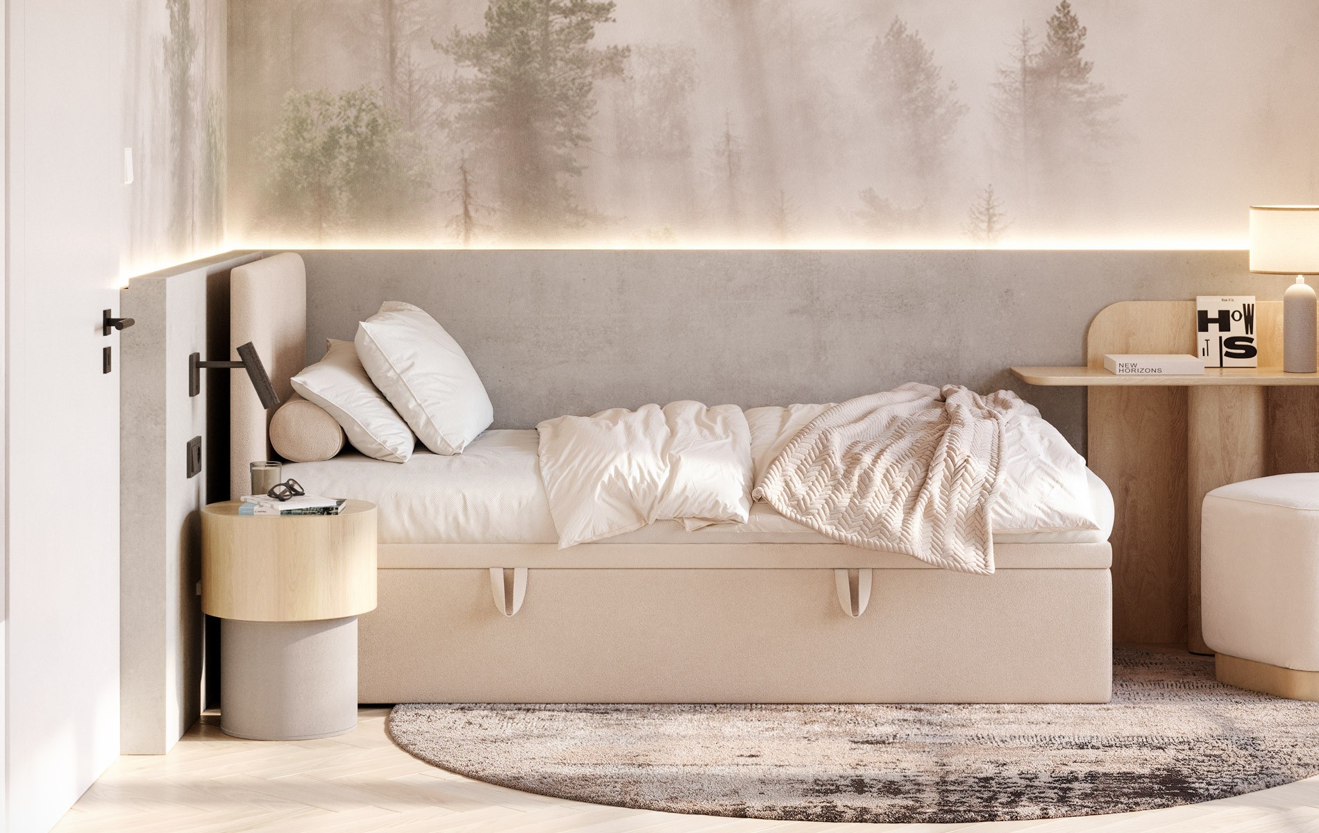 Więcej miejsca bez dodatkowych mebli. Pojemnik pod łóżkiem pozwala przechowywać kołdry, poduszki oraz sezonowe tekstylia w jednym miejscu, dzięki czemu pokój wygląda czyściej i bardziej uporządkowanie.
