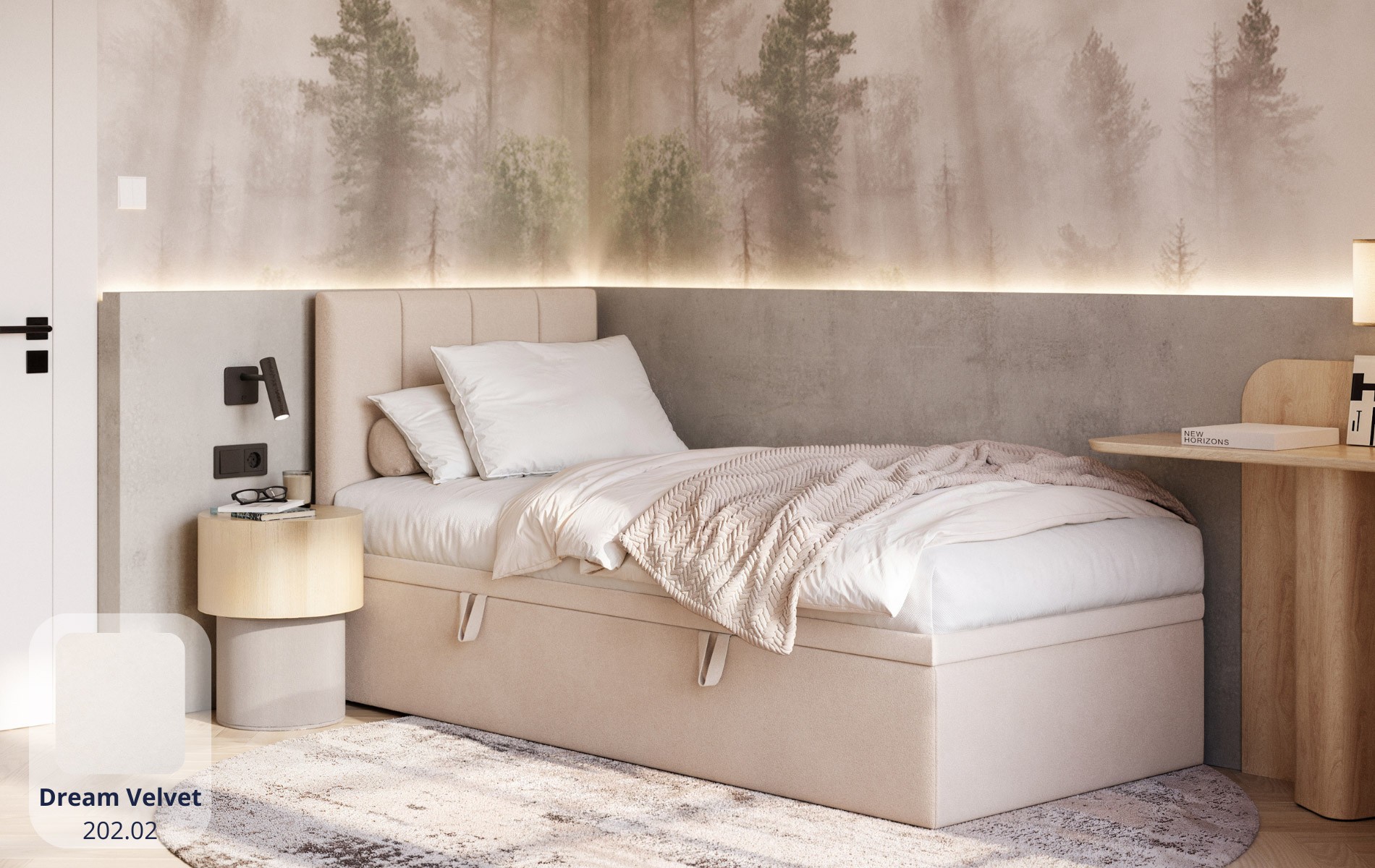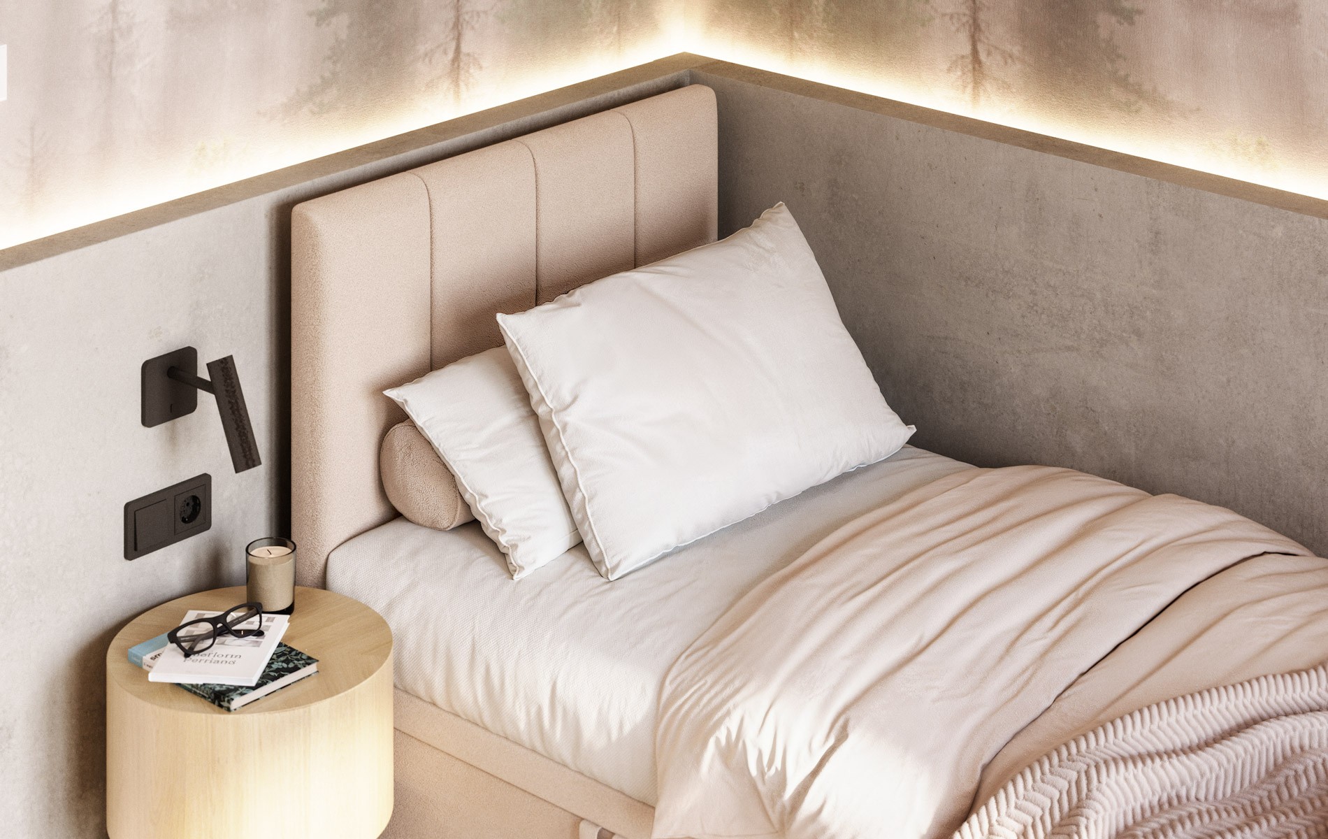LunaBed ADRIA to nowoczesne łóżko o lekkiej, minimalistycznej formie, stworzone z myślą o komforcie i harmonii we wnętrzu. Miękko tapicerowany zagłówek zapewnia wygodne oparcie podczas wieczornego relaksu, a praktyczna baza z pojemnikiem pomaga utrzymać porządek bez dokładania dodatkowych mebli.