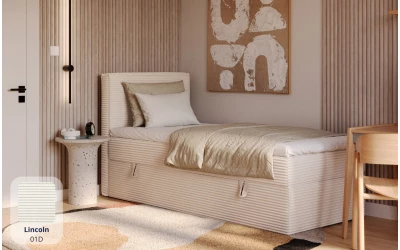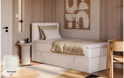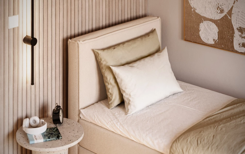 LunaBed CELESTE to łóżko jednoosobowe w stylu kontynentalnym – materac sprężynowy jest wbudowany w konstrukcję łóżka, a całość uzupełnia topper, który zwiększa komfort snu i nadaje powierzchni spania przyjemną miękkość. Subtelna, harmonijna forma oraz miękko tapicerowane wezgłowie budują przytulny klimat wnętrza i zapewniają wygodne oparcie podczas odpoczynku.