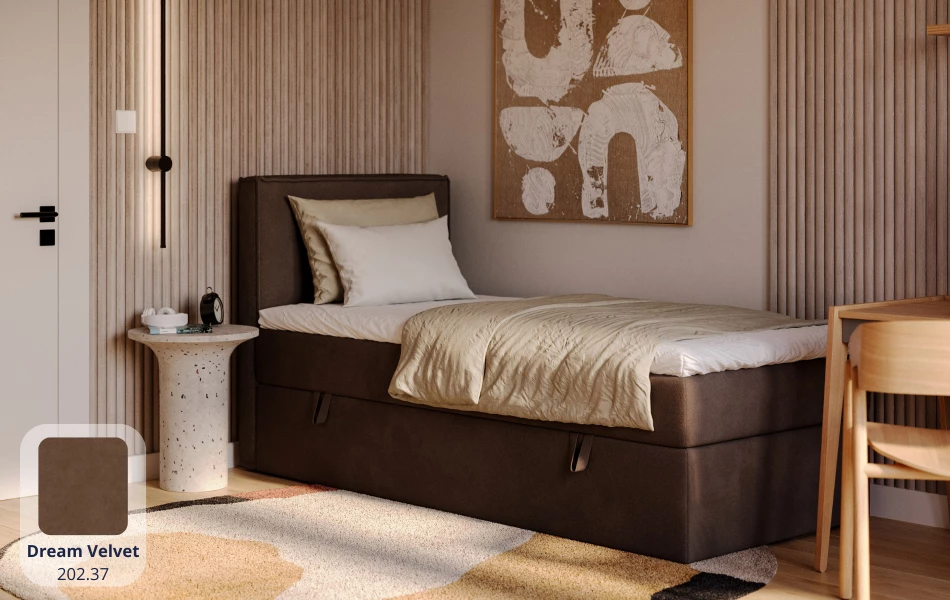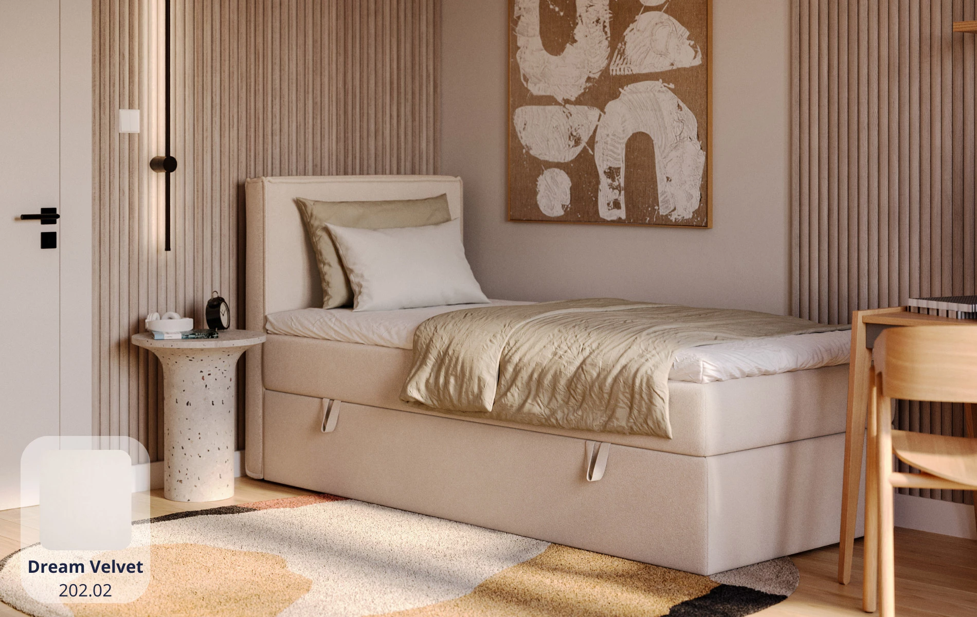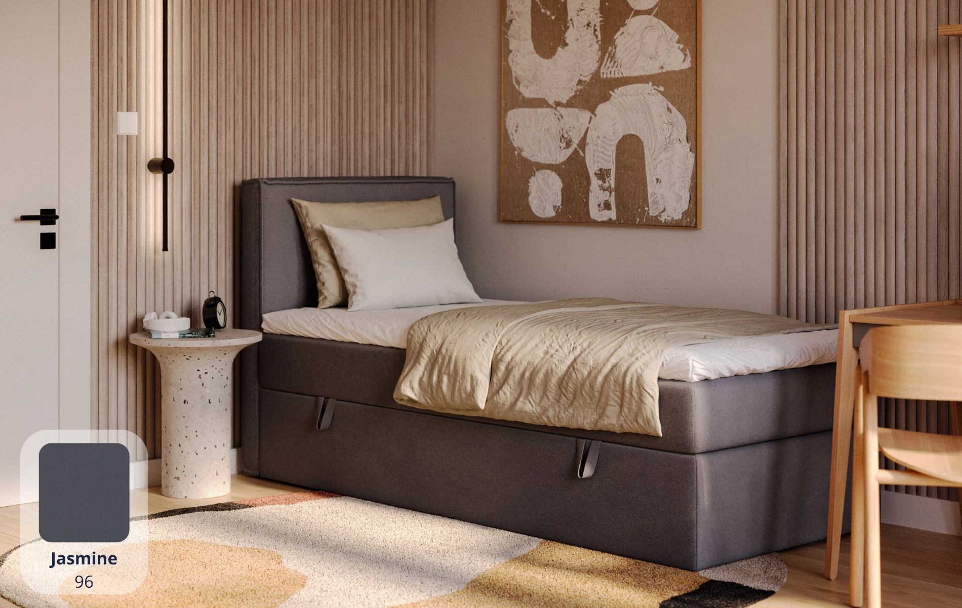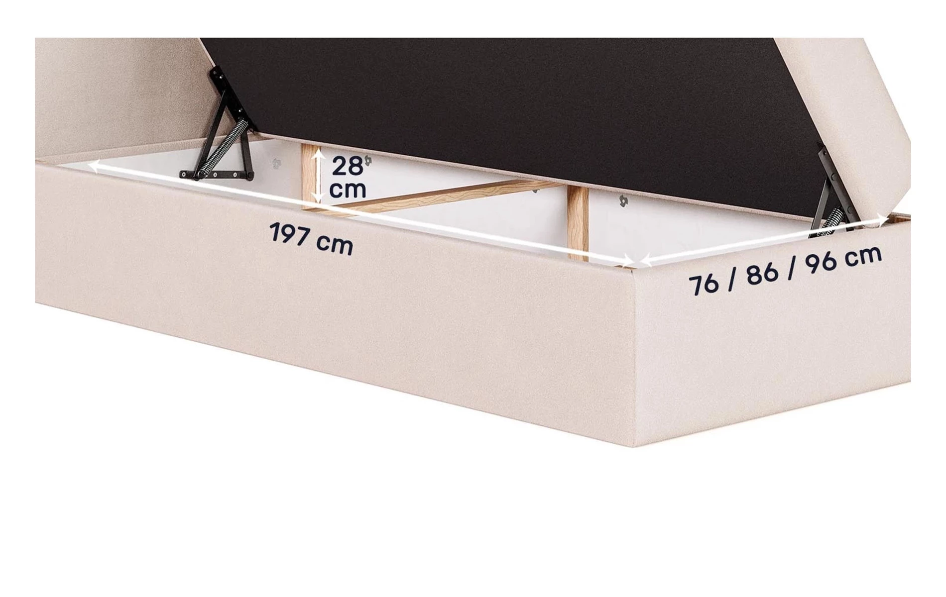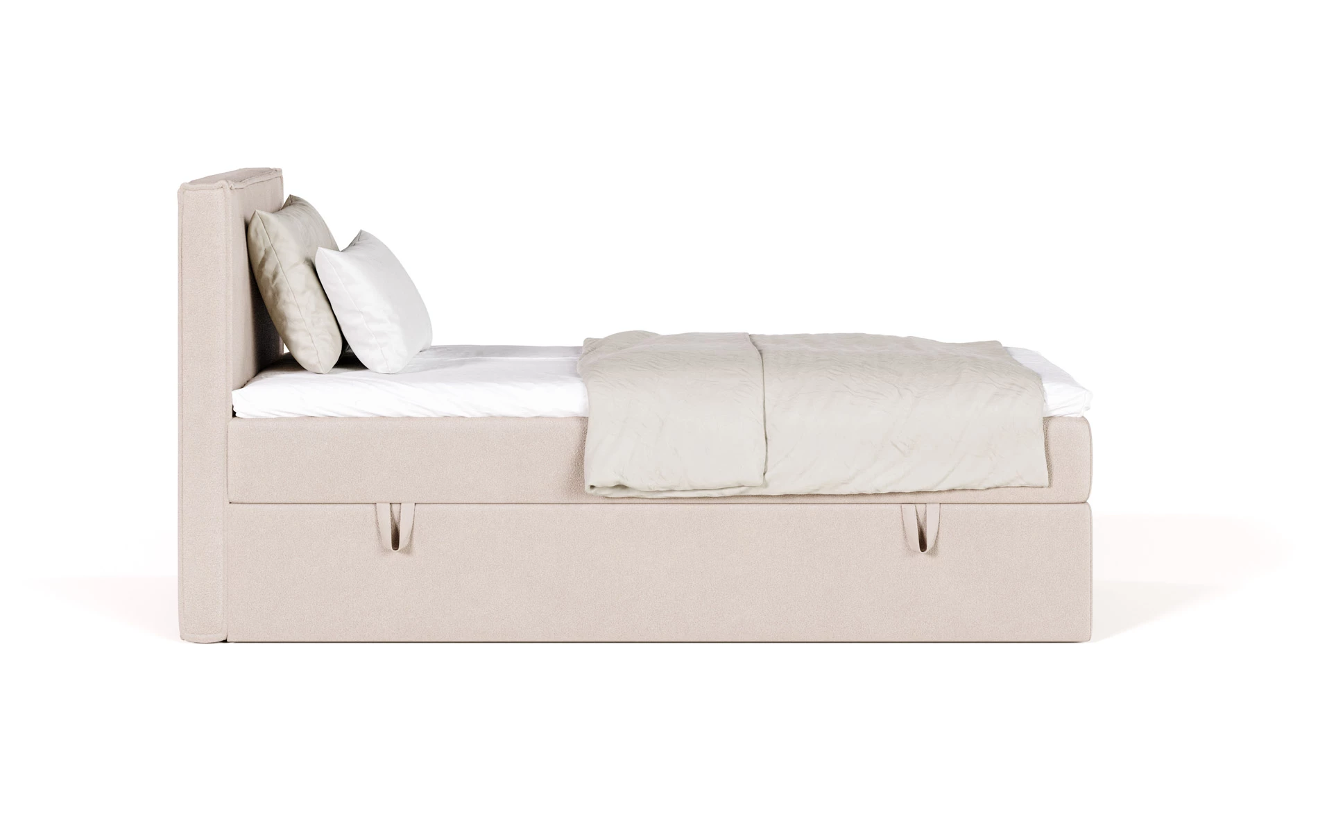 Komfort kontynentalny + funkcjonalność. CELESTE łączy wygodę spania na łóżku kontynentalnym (wbudowany materac sprężynowy + topper) z praktycznym pojemnikiem – bez kompromisów.