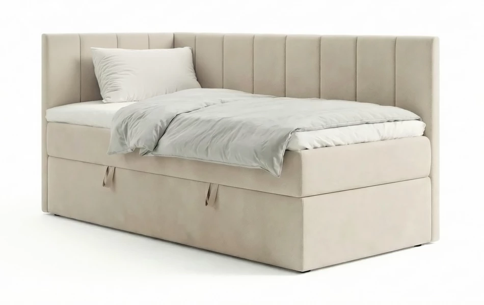 LunaBed STELLA to łóżko jednoosobowe w stylu kontynentalnym: materac sprężynowy jest wbudowany w konstrukcję łóżka, a całość uzupełnia topper, który podnosi komfort snu i poprawia odczucie „miękkości” powierzchni. Narożne wezgłowie porządkuje przestrzeń w pokoju i daje wygodne oparcie podczas odpoczynku.