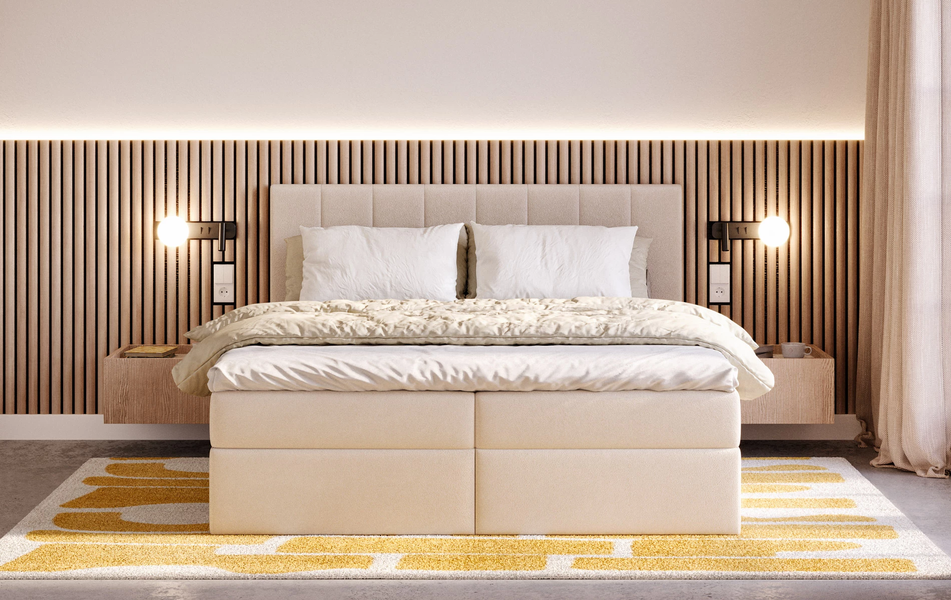 LunaBed POLARIS to łóżko kontynentalne dla dwóch osób, zaprojektowane z myślą o komforcie „hotelowym” na co dzień. Materac sprężynowy jest wbudowany w konstrukcję łóżka, a całość uzupełnia topper, który zwiększa wygodę snu i dodaje przyjemnej miękkości powierzchni spania. To rozwiązanie dla osób, które chcą mieć wysoki komfort, spójną bryłę łóżka i praktyczną funkcjonalność w jednym.
