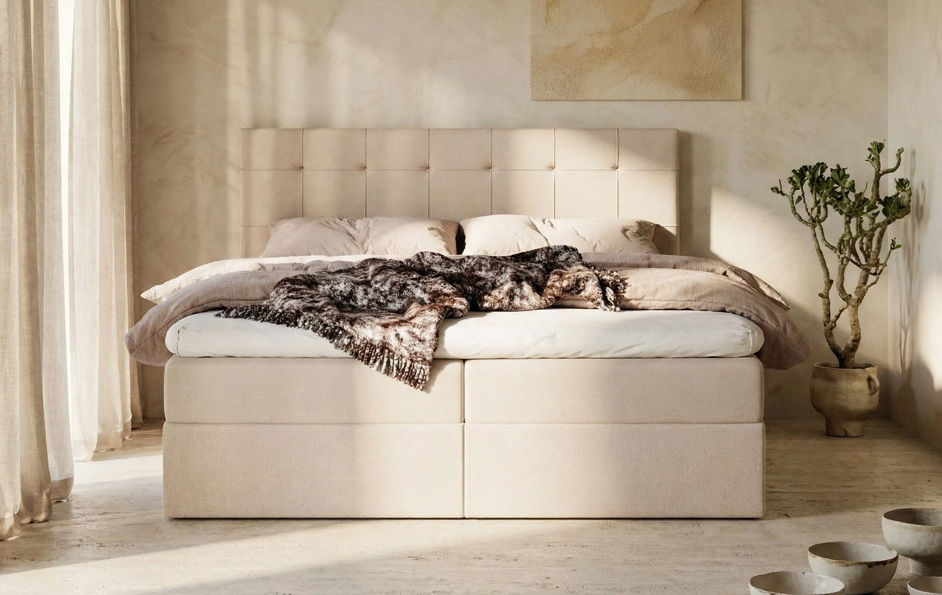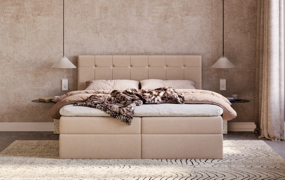 LunaBed CALLISTO to łóżko kontynentalne dla dwóch osób, które zapewnia wysoki komfort snu i elegancki, spójny wygląd sypialni. Materac sprężynowy jest wbudowany w konstrukcję łóżka, a całość uzupełnia topper, dzięki czemu powierzchnia spania jest równa, przyjemnie miękka i daje odczuwalny efekt „hotelowy” na co dzień.