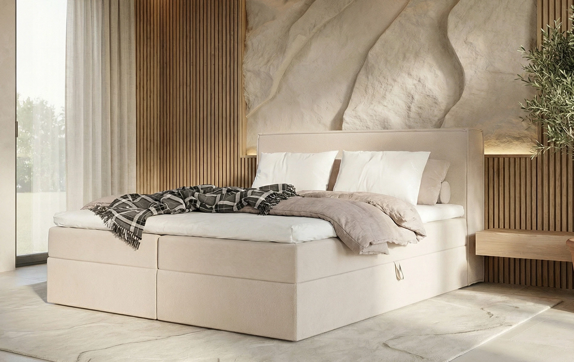 - ✔ Komfort kontynentalny: wbudowany materac + topper