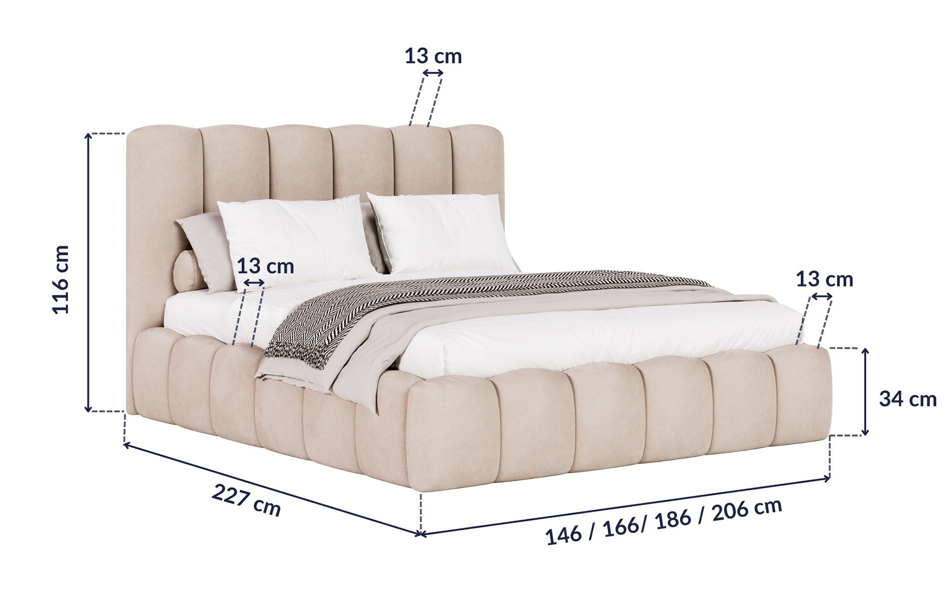 Na grafice znajdziesz kluczowe wymiary modelu WEZEN: wysokość wezgłowia 116 cm, długość całkowitą 227 cm oraz szerokość całkowitą łóżka zależną od wybranego rozmiaru. Dokładnie: 146 / 166 / 186 / 206 cm to szerokość zewnętrzna łóżka dla rozmiarów materaca 120 / 140 / 160 / 180 × 200 cm.