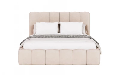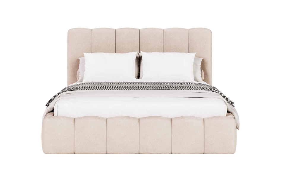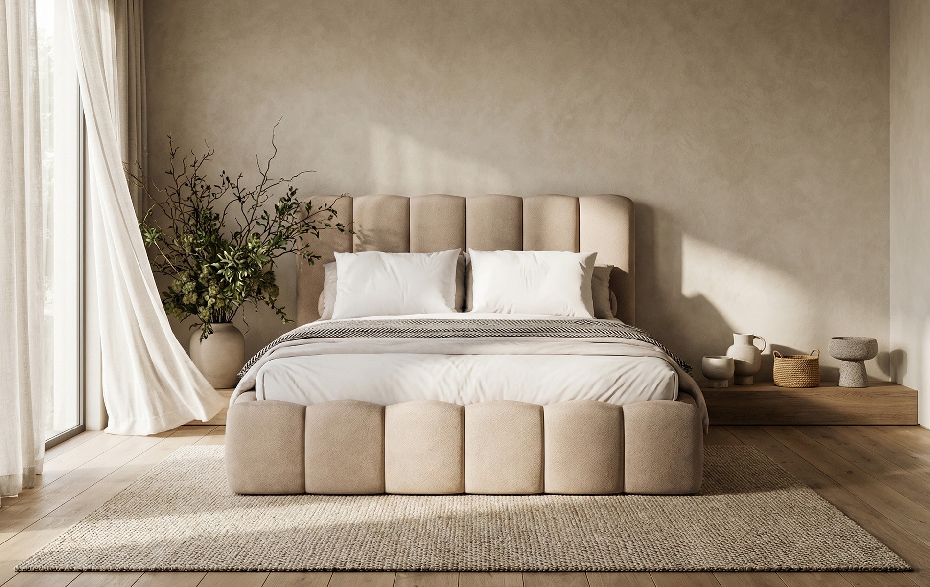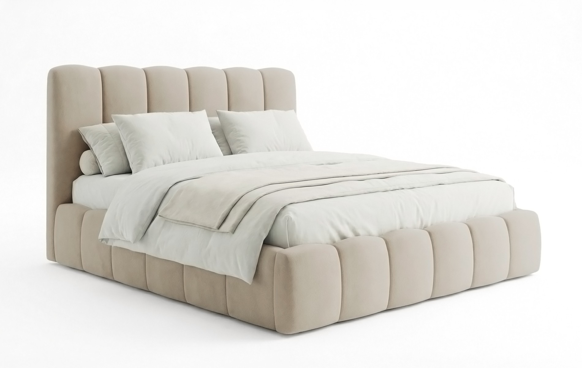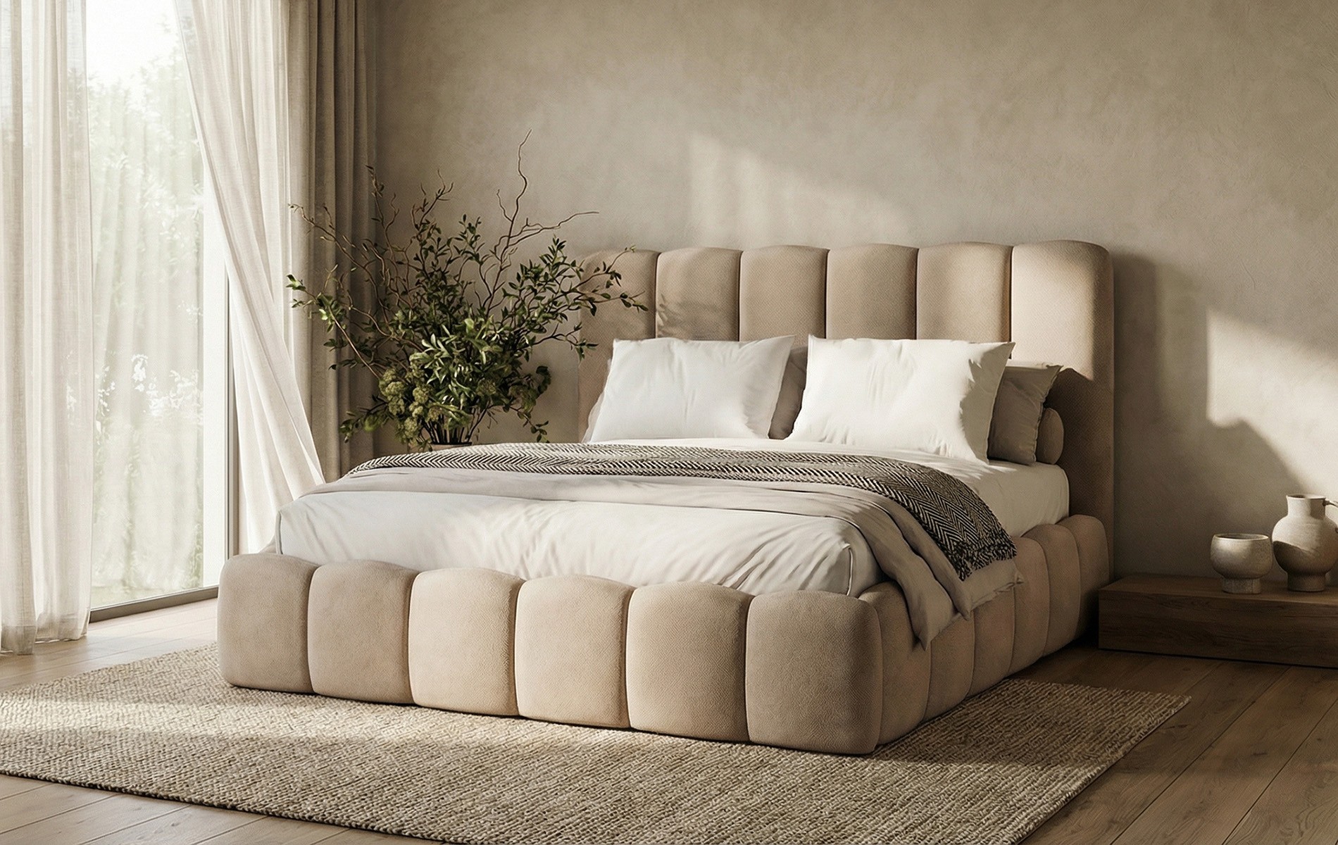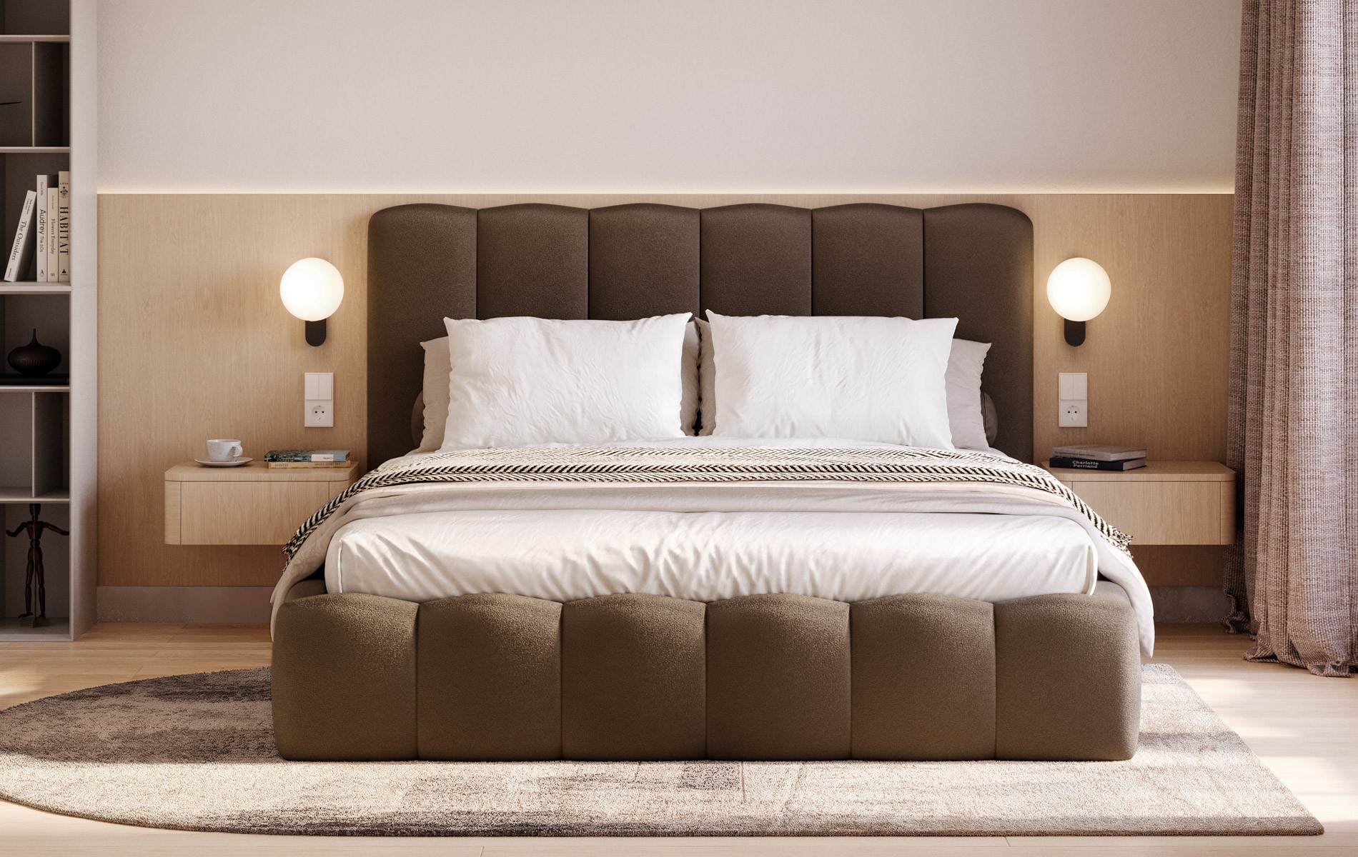 LunaBed WEZEN to łóżko tapicerowane, które od razu buduje „miękki” klimat sypialni. Charakterystyczne, pionowe panele na wezgłowiu i przedniej części łóżka nadają mu nowoczesny wygląd, a zaokrąglone krawędzie sprawiają, że bryła wygląda lekko i premium – nawet w minimalistycznych wnętrzach.