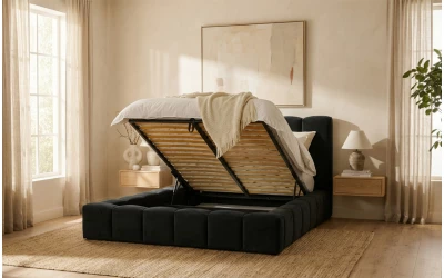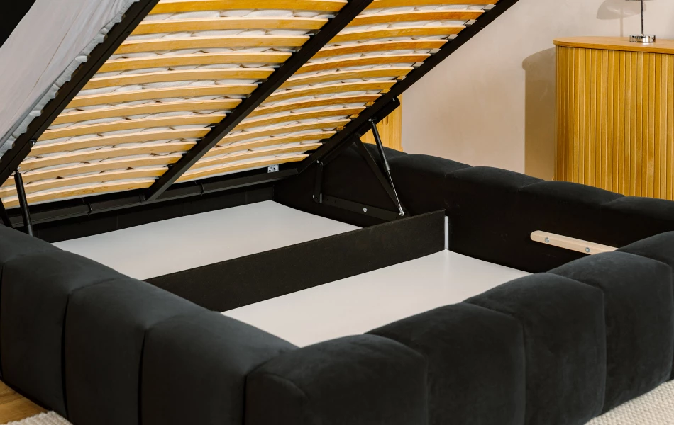 Praktyczne przechowywanie bez dodatkowych mebli. Wersja z pojemnikiem pozwala schować kołdry, poduszki i sezonowe tekstylia, dzięki czemu sypialnia wygląda czyściej i spokojniej.