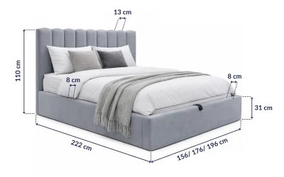 Ważne: podane na grafice wartości 156 / 176 / 196 cm oznaczają całkowitą szerokość łóżka (z tapicerowaną ramą) – zależnie od wybranego rozmiaru. Odpowiada to rozmiarom materaca: 140 / 160 / 180x200 cm.