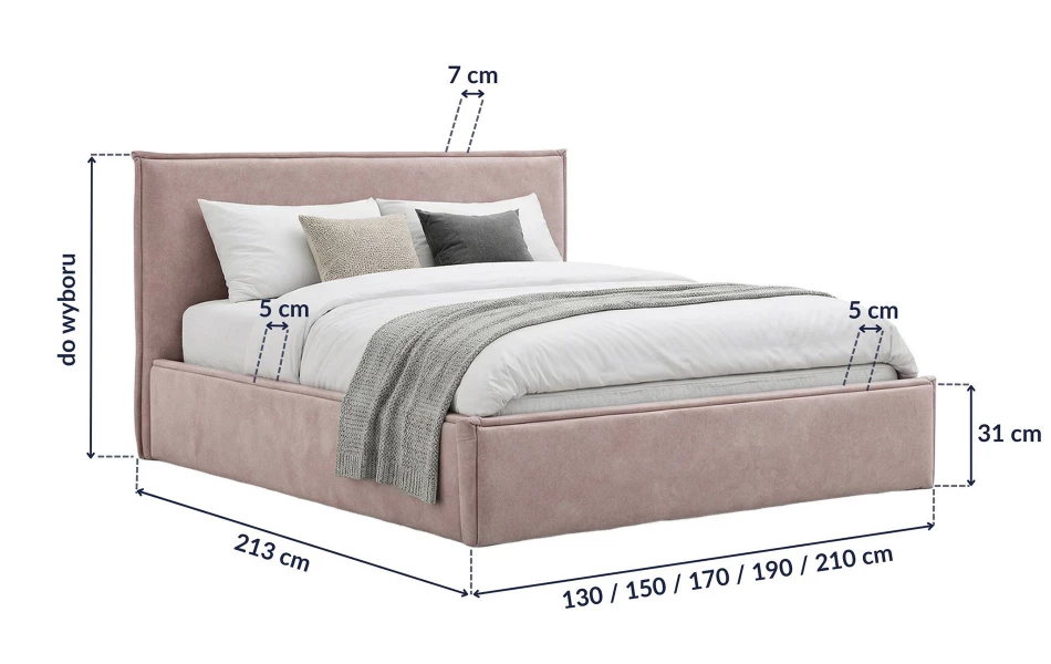 Ważne: podane na grafice wartości 130 / 150 / 170 / 190 / 210 cm oznaczają całkowitą szerokość łóżka (z tapicerowaną ramą) – zależnie od wybranego rozmiaru. Odpowiada to rozmiarom materaca: 120 / 140 / 160 / 180 / 200x200 cm.