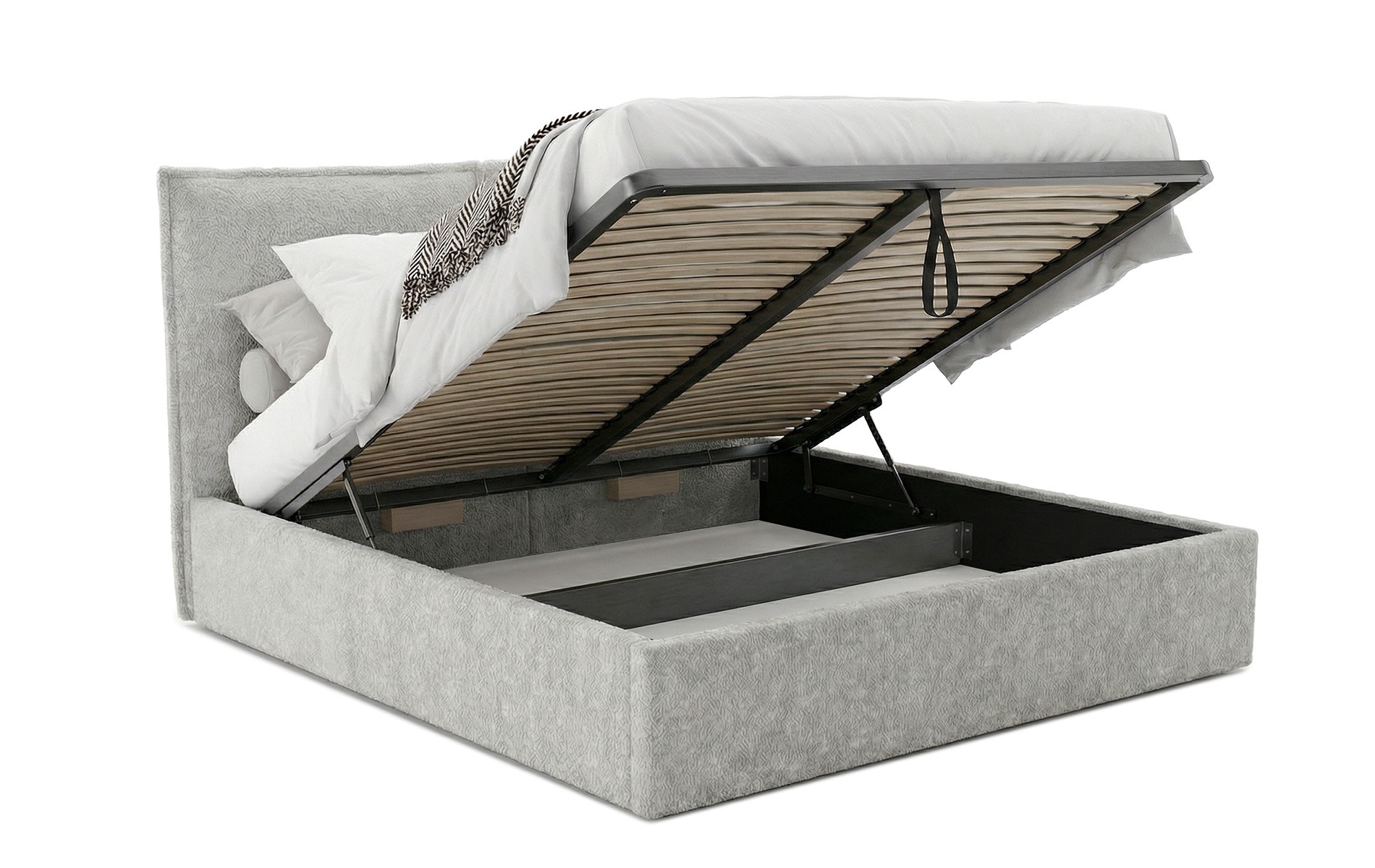 Więcej miejsca w sypialni. MERGA może być wyposażona w pojemnik na pościel, który pozwala wygodnie schować kołdry, poduszki i tekstylia sezonowe – bez dokładania komód czy skrzyń.