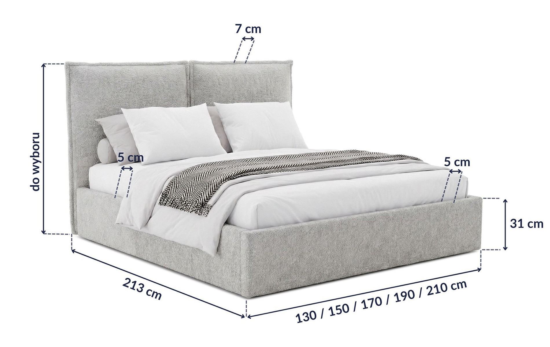 Ważne: podane na grafice wartości 130 / 150 / 170 / 190 / 210 cm oznaczają całkowitą szerokość łóżka (z tapicerowaną ramą) – zależnie od wybranego rozmiaru. Odpowiada to rozmiarom materaca: 120 / 140 / 160 / 180 / 200x200 cm.
