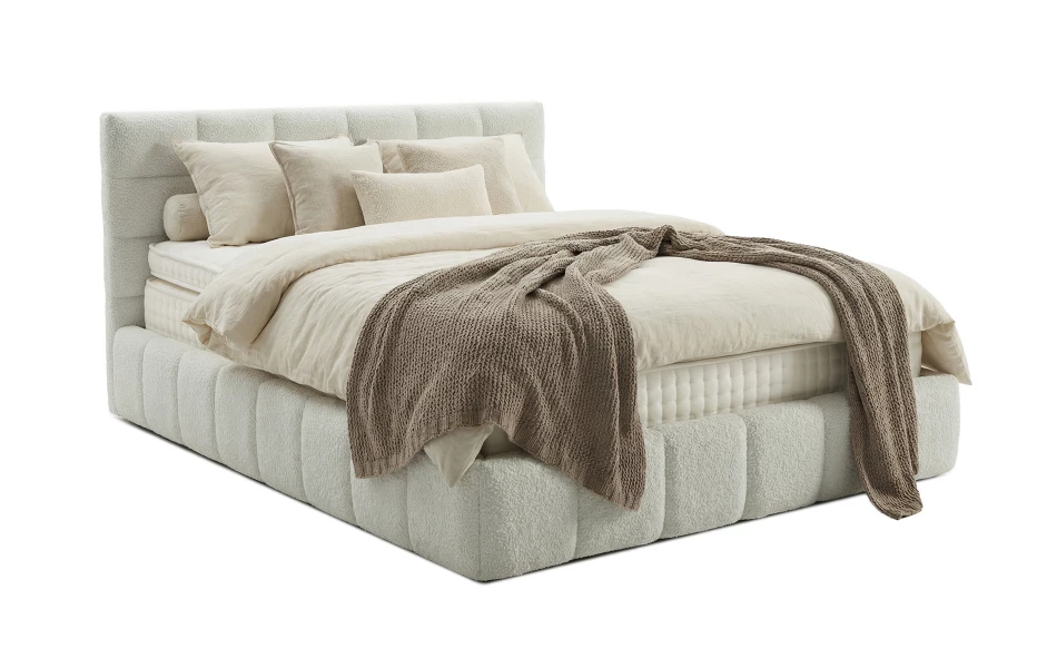 Estetyka w pakiecie. Zabudowana, tapicerowana forma łóżka utrzymuje porządek wizualny – nawet przy minimalistycznej sypialni wszystko wygląda spójnie.