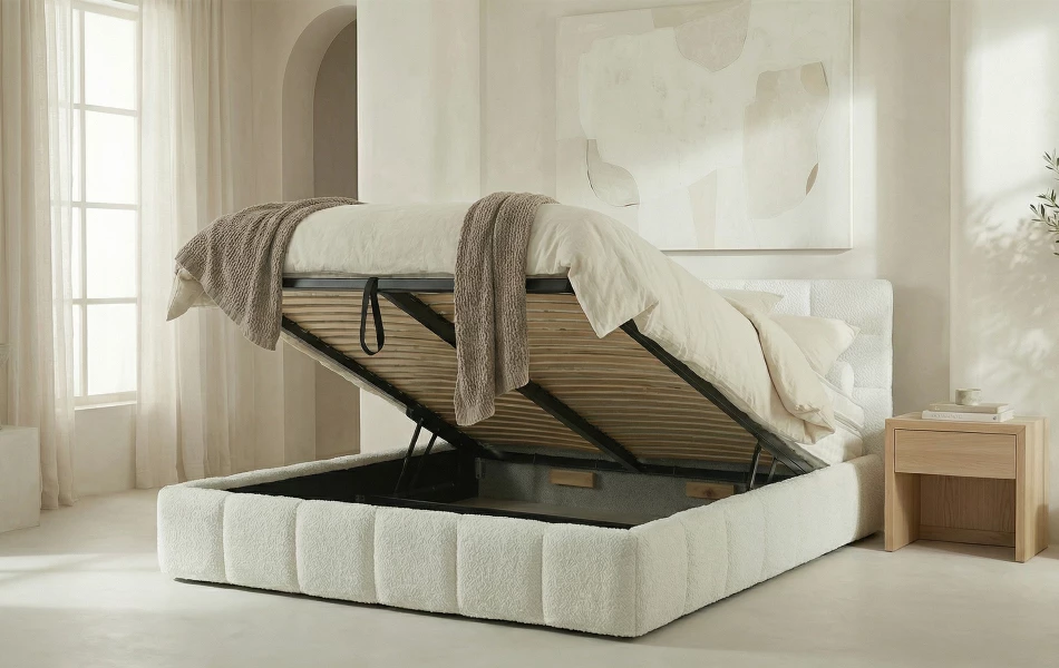 Więcej przestrzeni bez dodatkowych mebli. VELA może być wyposażona w praktyczny pojemnik, który świetnie sprawdza się na kołdry, poduszki, narzuty czy sezonowe tekstylia.