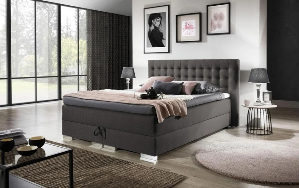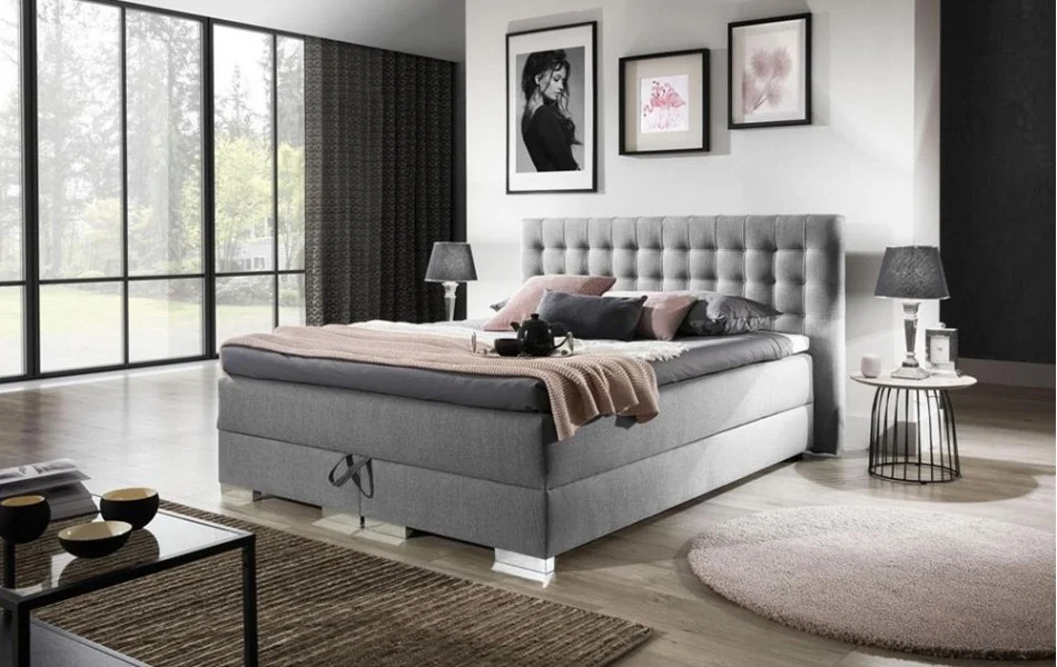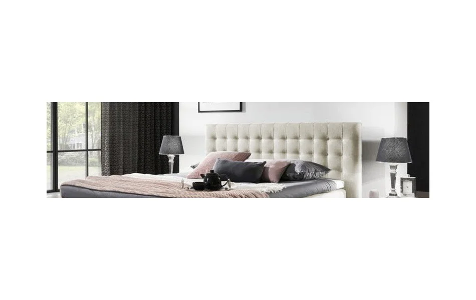 Łóżko tapicerowane Filip 2 to łóżko kontynentalne z pojemnikiem na pościel. Wezgłowie ozdabiają poziomie i pionowe przeszycia.