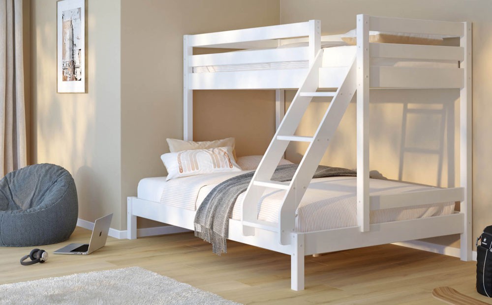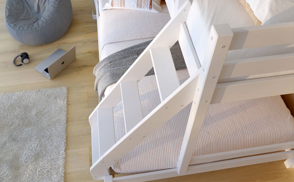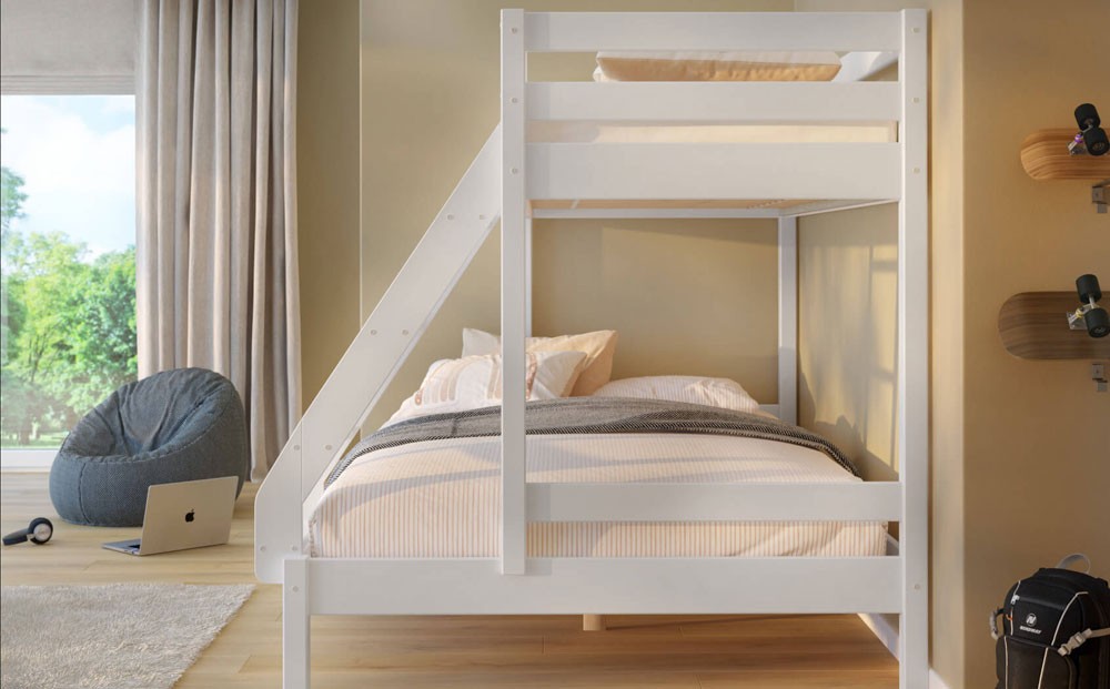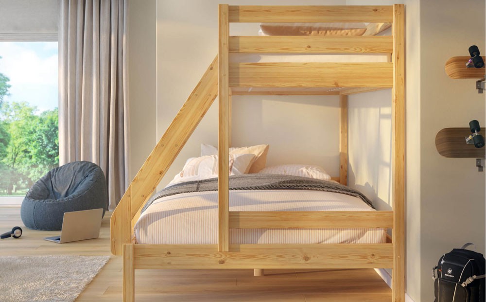 Łóżko piętrowe Summer marki Senpuro Teak to 3-osobowe funkcjonalne i eleganckie rozwiązanie, idealne dla rodzin i pomieszczeń o ograniczonej przestrzeni.
