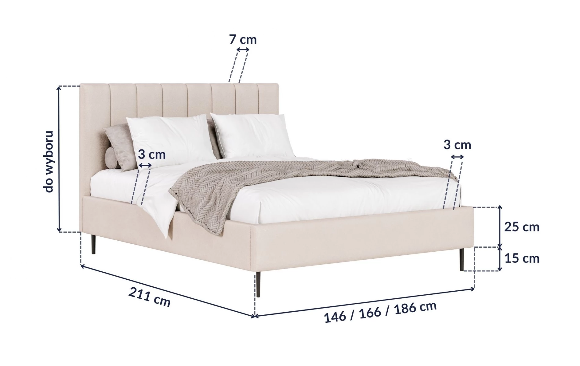 ● długość: 211 cm, szerokość: 166 cm, powierzchnia spania: 160x200 cm,