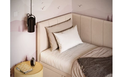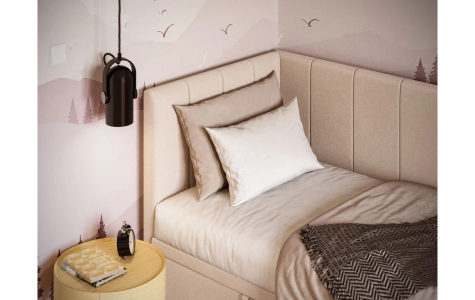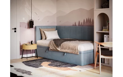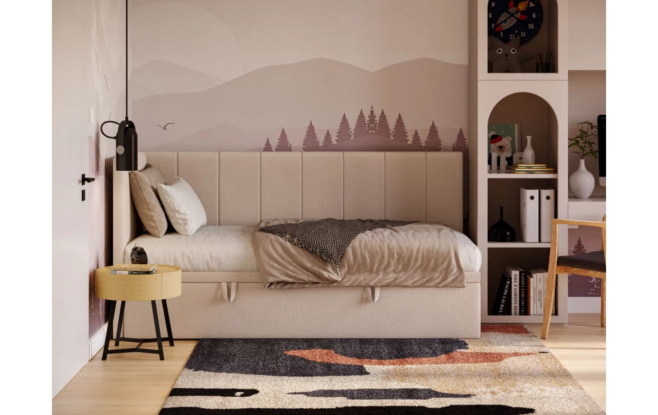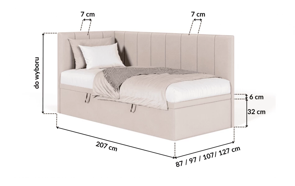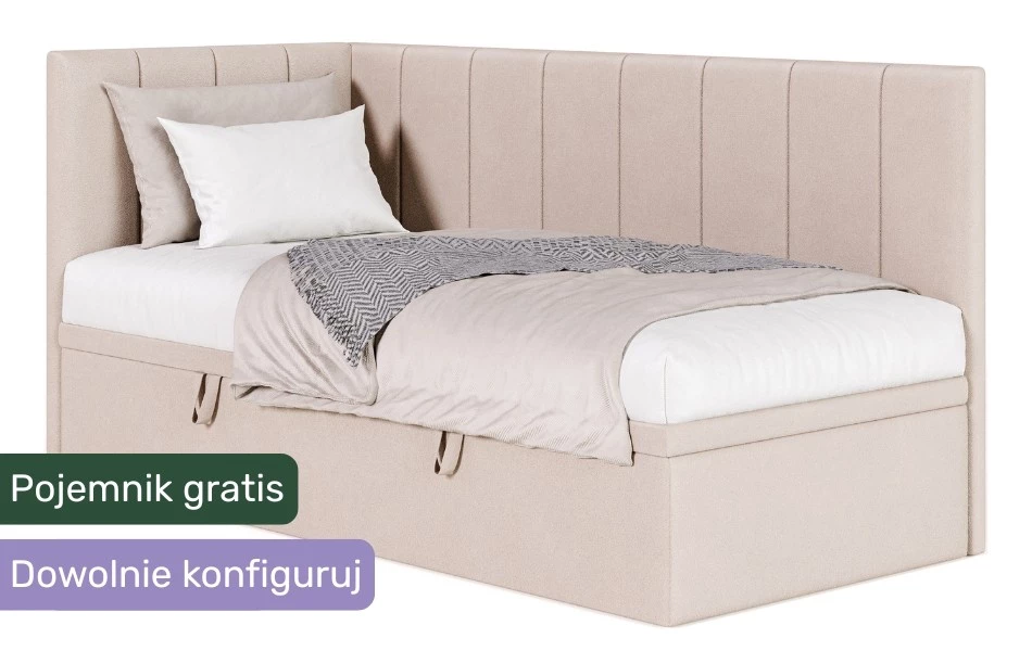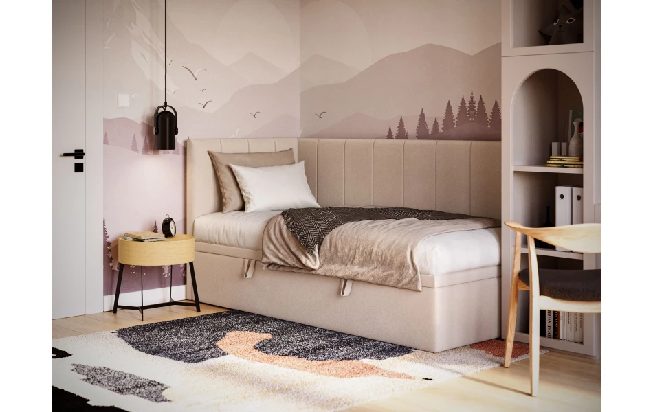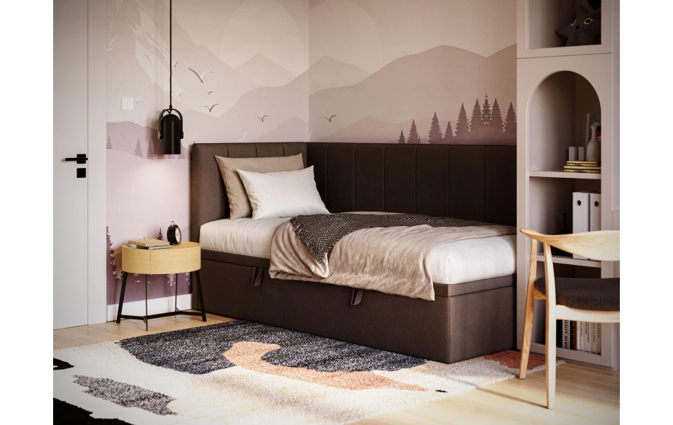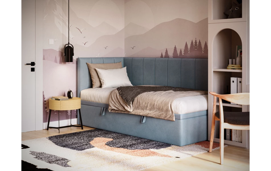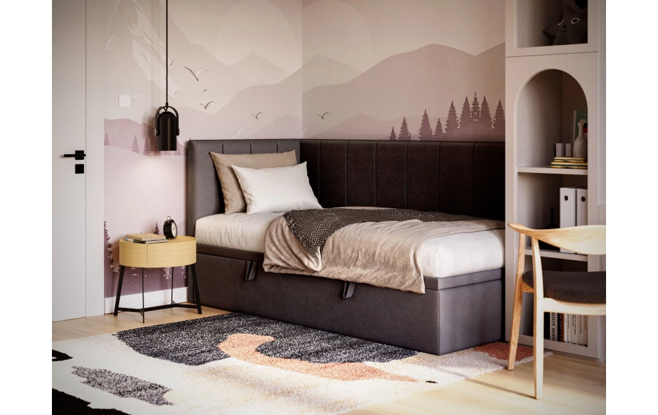 Łóżko młodzieżowe AURORA łączy nowoczesny design z praktycznym zastosowaniem. Dzięki narożnemu wezgłowiu można je łatwo dopasować do różnych układów wnętrza, tworząc komfortową przestrzeń do wypoczynku. Dodatkowy atut stanowi pojemnik na pościel, który pomaga utrzymać porządek i maksymalnie wykorzystać przestrzeń w sypialni.