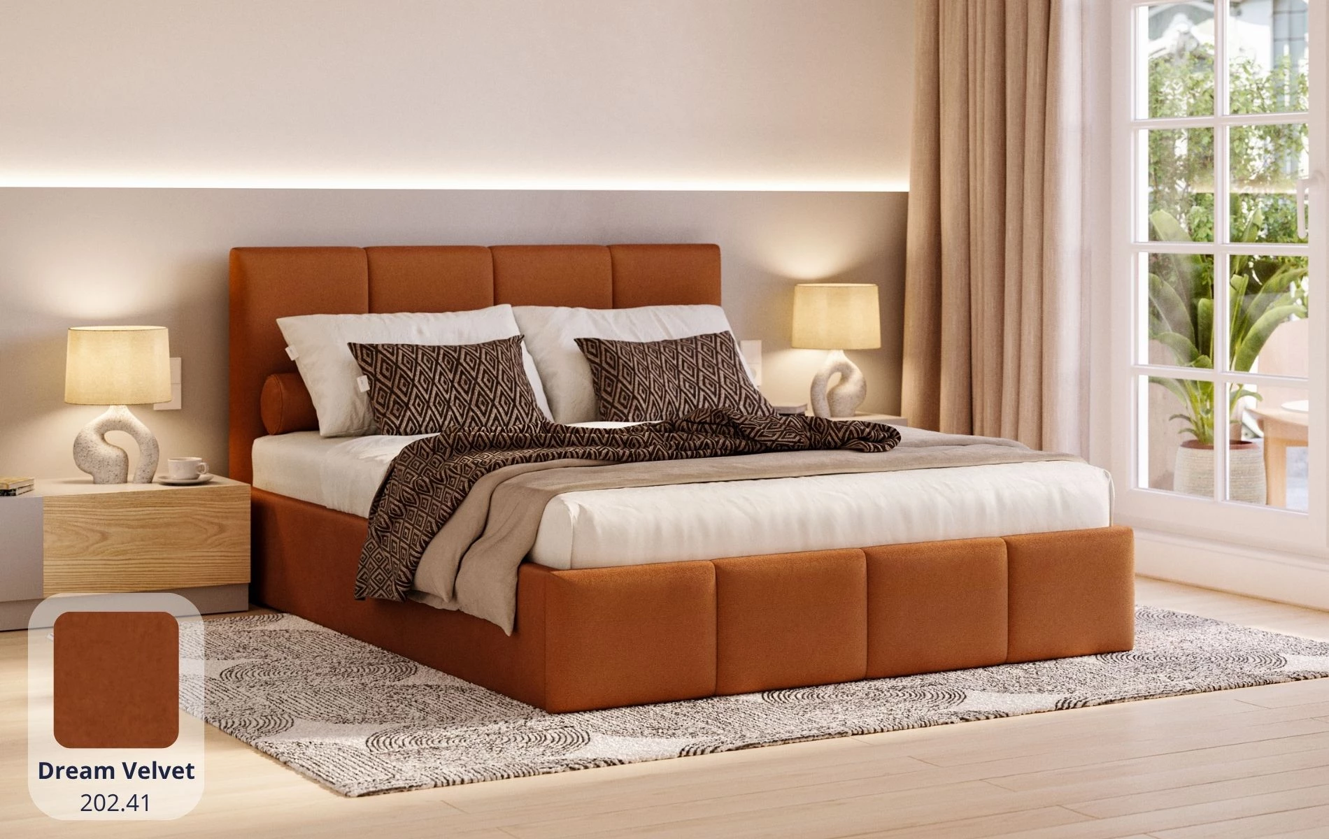 Nowoczesne łóżko LYRA przyciąga uwagę miękkimi liniami i efektownym pikowaniem wezgłowia oraz frontu, tworząc przytulną atmosferę w każdej sypialni. Wbudowany pojemnik na pościel i elastyczny stelaż na metalowej ramie stanowią kompletny zestaw, który zapewnia wygodę i funkcjonalność na co dzień.