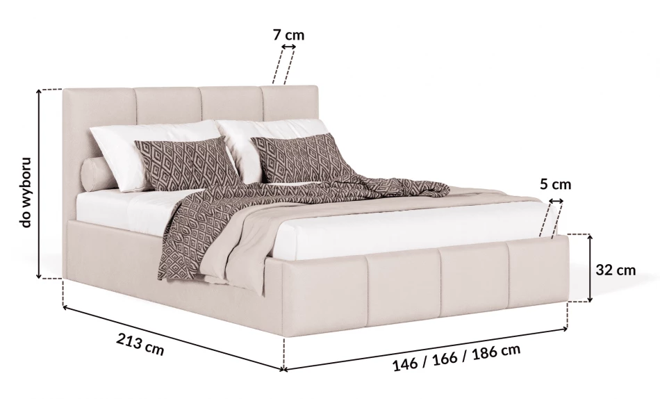 ● długość: 213 cm, szerokość: 166 cm, powierzchnia spania: 160x200 cm,