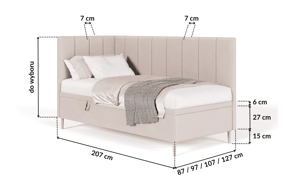 Dzięki prostemu konfiguratorowi stworzysz swoje wymarzone łóżko w kilka chwil. Wybierz kolor i rodzaj tkaniny. Określ wysokość wezgłowia - pozwoli Ci to dopasować łóżko w mniej ustawnej przestrzeni lub zapewnić sobie wygodne oparcie w czasie wieczornego relaksu.