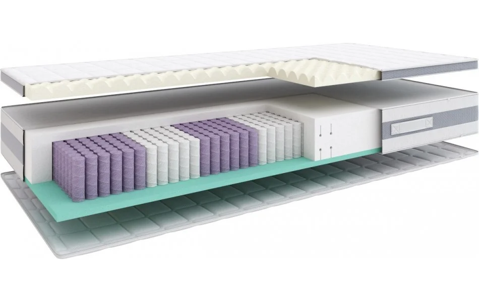 Materac hybrydowy został wykonany na bazie 7-strefowej sprężyny typu Multi, którą otoczono dwiema warstwami wysokoelastycznych pianek o różnym stopniu twardości. Boki zabezpiecza pianka FlexiFoam, a wierzchnia warstwa modelu to top.