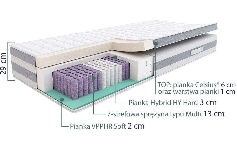 Za wysoką elastyczność punktową pozwalającą na swobodną zmianę pozycji w czasie snu w tym modelu odpowiada 7-strefowy wkład ze sprężyn typu Multipocket o wysokości 13 cm – najlepszy wśród rozwiązań sprężynowych. Pianka termoelastyczna Celsius® - Waterlily® reaguje nie tylko na ciężar ciała, ale również na temperaturę, przyjmując kształt w pełni dostosowany do potrzeb użytkownika.