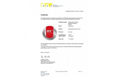 Właściwości prozdrowotne – sen na materacach SleepMed sprzyja Twojemu zdrowiu. Ich bezpieczeństwo i jakość potwierdza certyfikat AEH.
