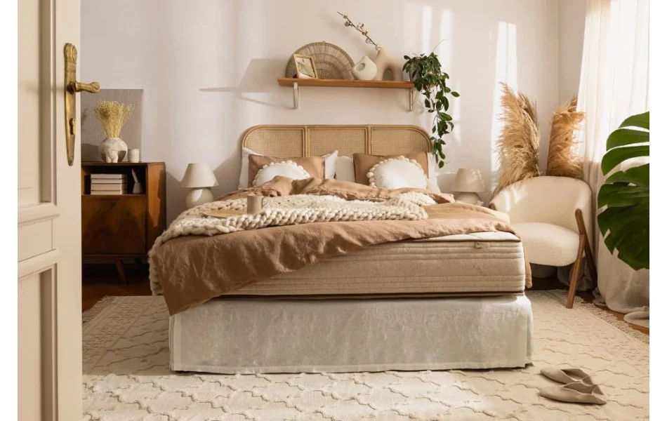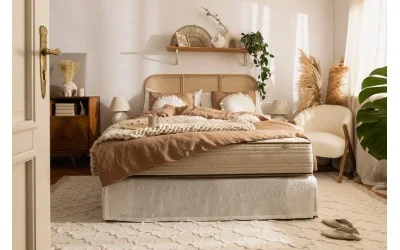 WKŁAD: 7-strefowe sprężyny Multipocket, po jednej stronie pianka HR Bio o wys. 4 cm (średnia twardość), po drugiej stronie blat naturalnego lateksu o wys. 4 cm (strona twarda)