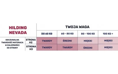 Wierzchnią warstwę stanowi płyta naturalnego lateksu. Zadbaliśmy o to by lateks był pozyskiwany jest jedynie z rygorystycznie wybranych i ściśle regulowanych plantacji. Lateks idealnie dopasowuje się do kształtu ciała, w związku z czym zapewnia bardzo dobre podparcie dla kręgosłupa podczas snu, jest bardzo elastyczny i sprężysty dzięki czemu ułatwia przewracanie się z boku na bok czy wstawanie. Po drugiej stronie znajduję się pianka wysokoelastyczna HR , w której naturalny olejek sojowy zastępuję chemiczne związki. Pianka posiada otwartokomórkową strukturę, która która umożliwia optymalną cyrkulację powietrza przy zachowaniu doskonałej elastyczności. Jest bardzo sprężysta, redukuje nacisk punktowy, a jednocześnie nie pozwala aby ciało nie zapadało się nadmiernie. Rdzeń stworzony z 7-strefowego systemu sprężyn kieszeniowych Multipocket, które w porównaniu ze sprężynami kieszeniowymi wyróżniają się jedną istotną cechą – na każdy metr kwadratowy przypada ich więcej, a każda sprężynka pracuje osobno, zapewniając większą elastyczność punktową. Sprężynki o różnej twardości tworzą 7 zróżnicowanych stref, które gwarantują poszczególnym partiom ciała doskonałe wsparcie. Nevada dzięki właściwościom sprężyn Multipocket w połączeniu z warstwą lateksu to idealne rozwiązanie dla par oraz par z dużą różnicą wagową.