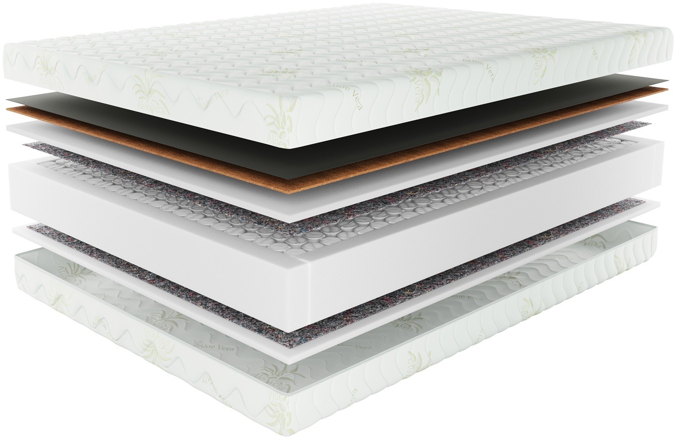 Tkanina osłaniająca kokos, wkład kokosowy, 2 cm pianki poliuretanowej Support White, warstwa filcu, 7-strefowa sprężyna kieszeniowa o wysokości 18 cm, warstwa filcu, 2 cm pianki poliuretanowej Support White.
