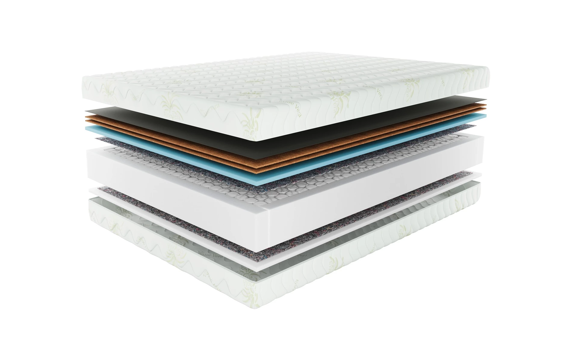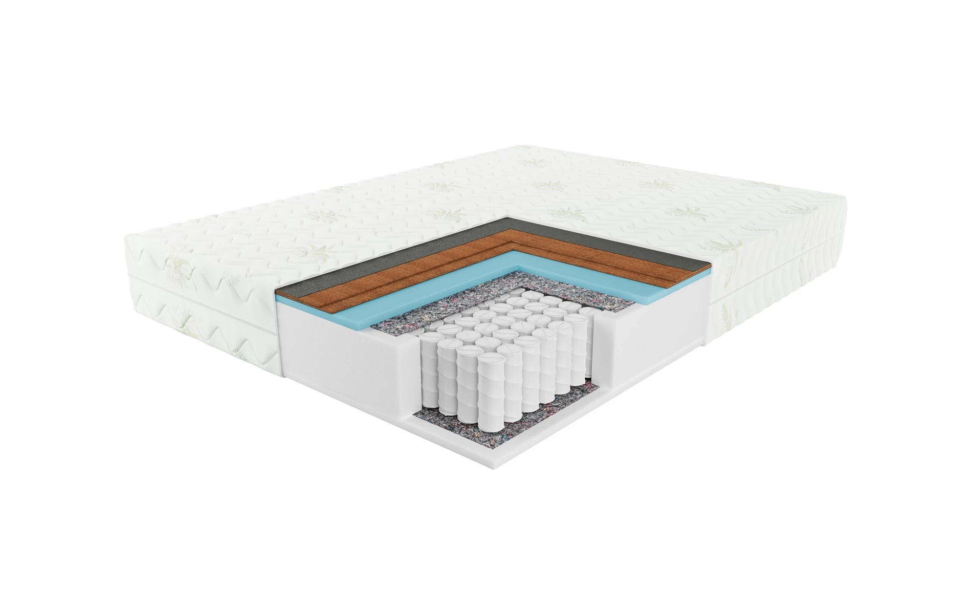 Tkanina osłaniająca kokos, 2 x wkład kokosowy, 2 cm wysokoelastycznej pianki Flex Blue, warstwa filcu, 7-strefowa sprężyna kieszeniowa o wysokości 18 cm, warstwa filcu, 2 cm pianki poliuretanowej Support White.