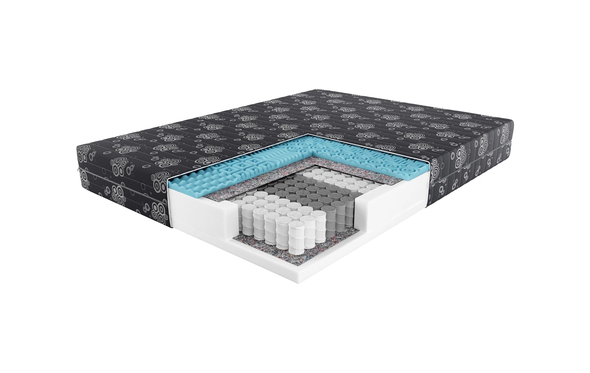 7-strefowy materac sprężynowy stworzony dla osób, które oczekują solidnego podparcia, elastycznego komfortu i trwałości na lata. Połączenie profilowanej pianki wysokoelastycznej, odpornej na odkształcenia pianki poliuretanowej oraz niezależnie pracujących sprężyn kieszeniowych tworzy konstrukcję, która ergonomicznie dopasowuje się do ciała, zapewniając stabilność, odpowiednią przewiewność i higieniczne warunki snu przez długi czas. Idealny dla osób śpiących na plecach, boku i brzuchu.