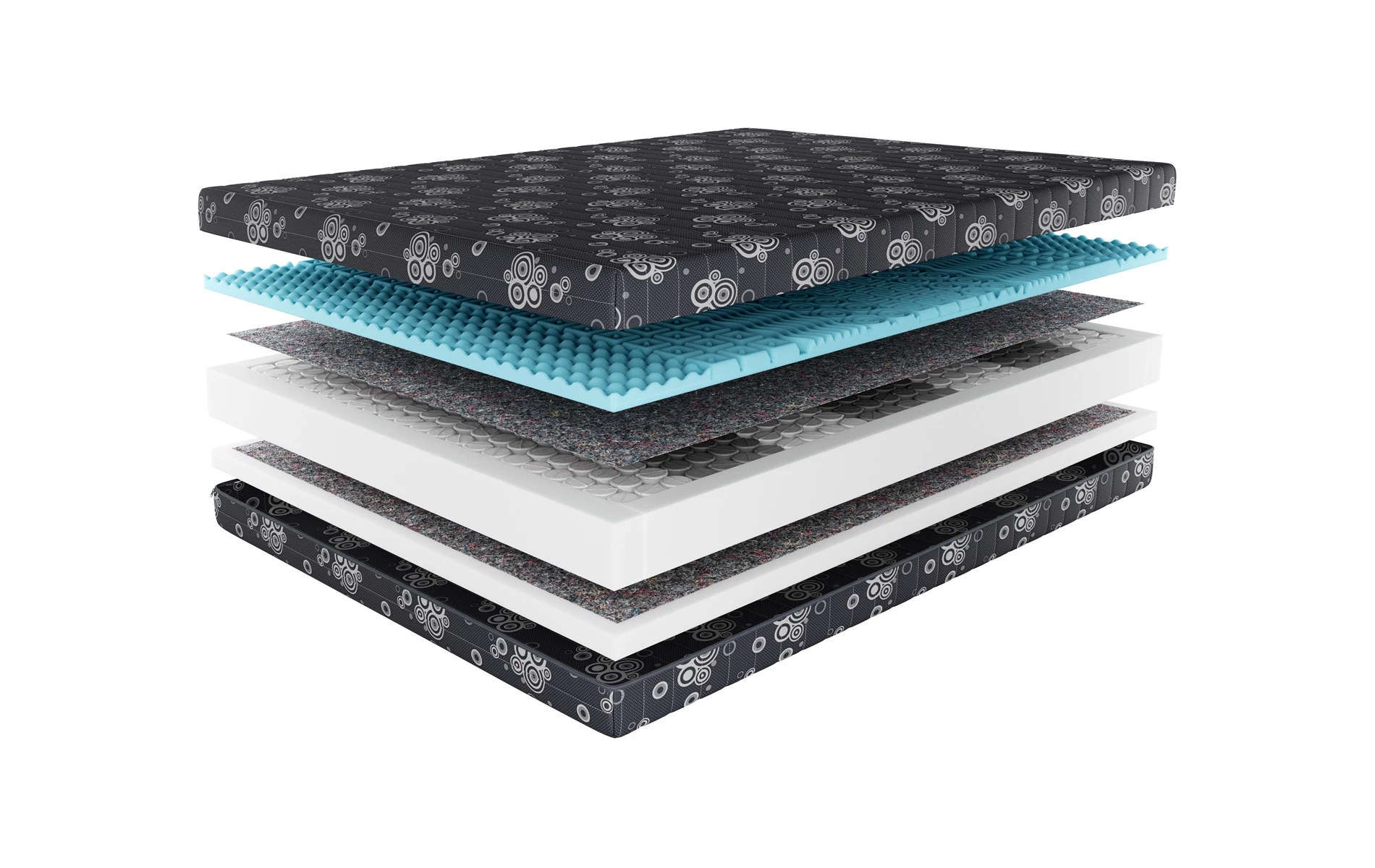 4 cm profilowanej, wysokoelastycznej pianki Flex Blue, warstwa filcu, 7-strefowa sprężyna kieszeniowa o wysokości 13 cm, warstwa filcu, 5 cm pianki poliuretanowej Support White.