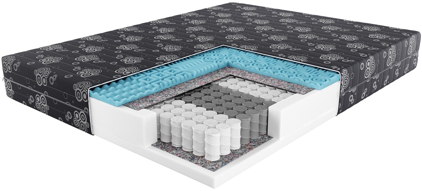 7-strefowy materac sprężynowy stworzony dla osób, które oczekują solidnego podparcia, elastycznego komfortu i trwałości na lata. Połączenie profilowanej pianki wysokoelastycznej, odpornej na odkształcenia pianki poliuretanowej oraz niezależnie pracujących sprężyn kieszeniowych tworzy konstrukcję, która ergonomicznie dopasowuje się do ciała, zapewniając stabilność, odpowiednią przewiewność i higieniczne warunki snu przez długi czas. Idealny dla osób śpiących na plecach, boku i brzuchu.