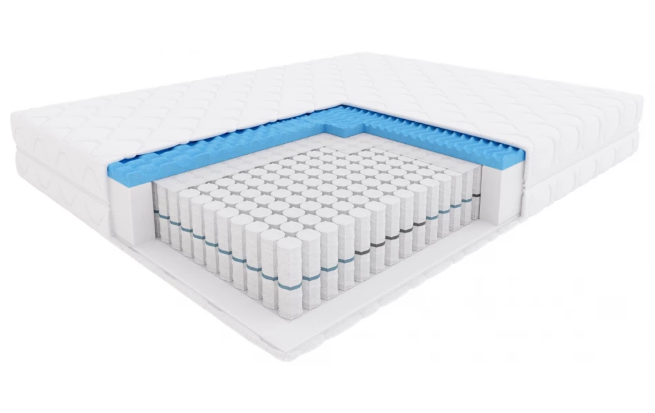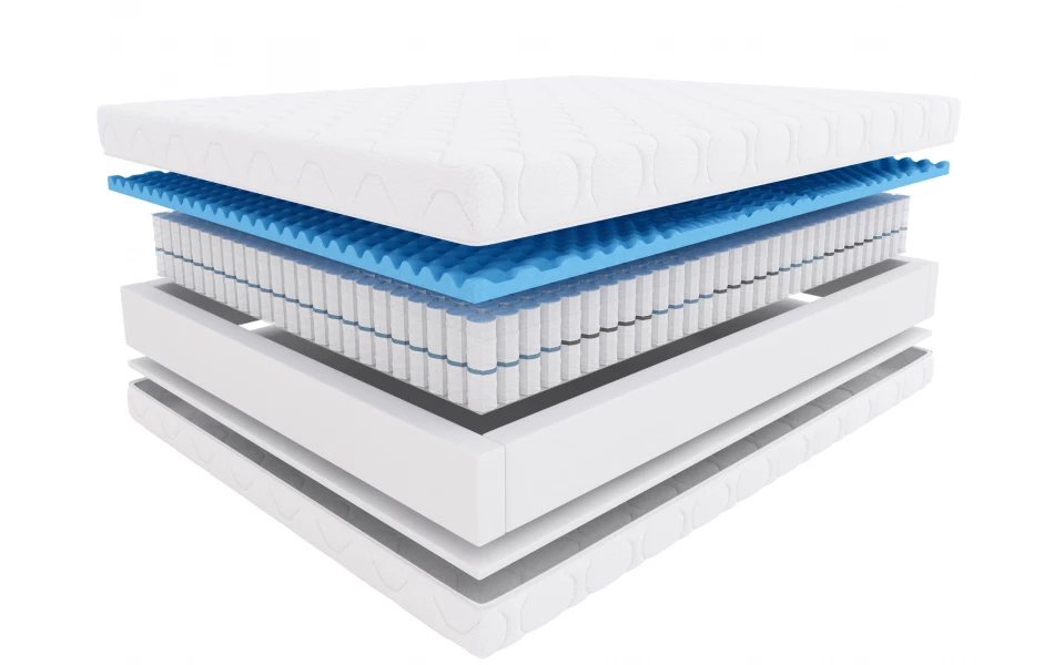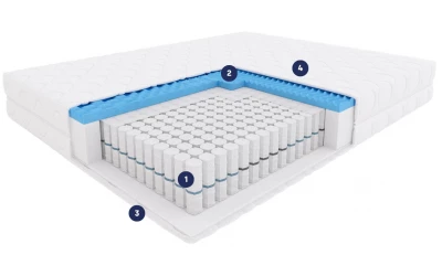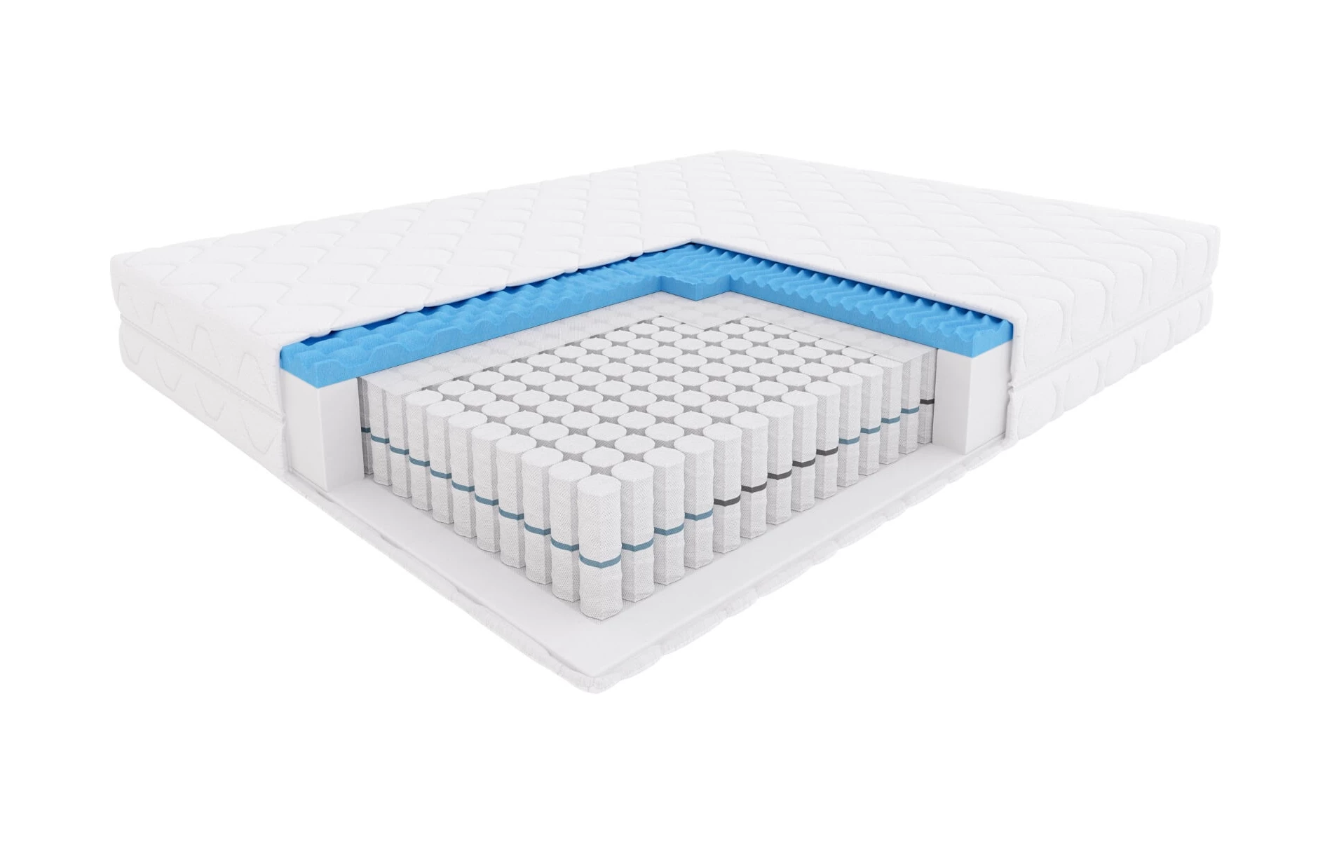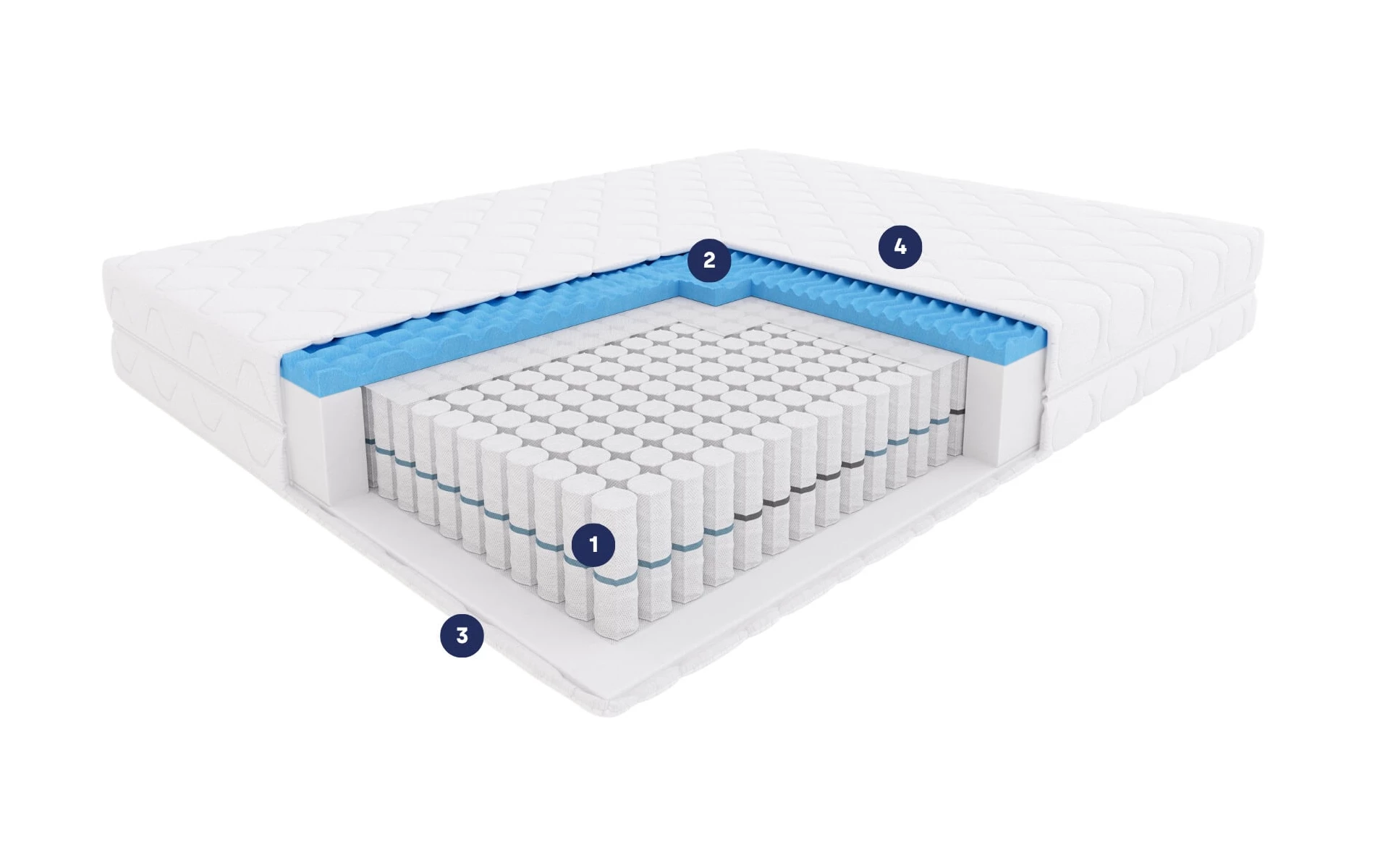 - Solidny system 5-strefowych sprężyn kieszeniowych o wysokości 18 cm. Każda sprężyna reaguje indywidualnie na nacisk, zapewniając punktowe podparcie i dostosowanie do budowy ciała. Po obu stronach rdzenia zastosowano warstwy.