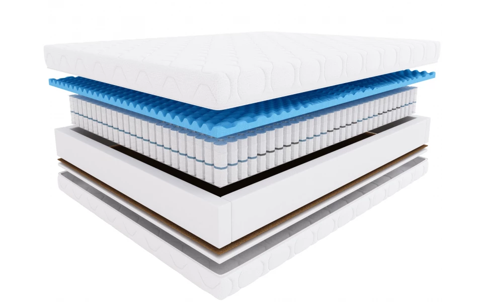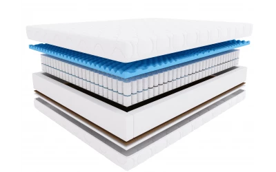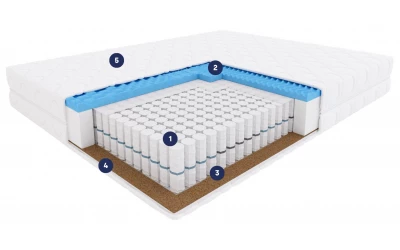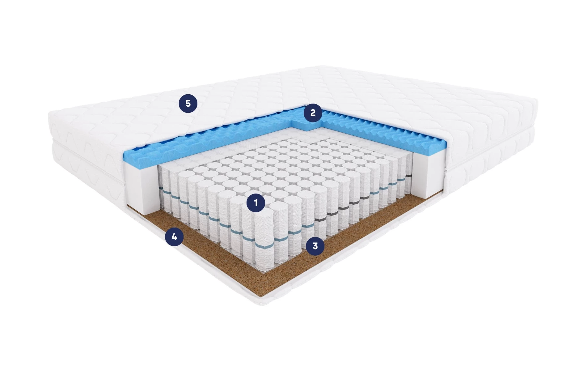 - Solidny system 5-strefowych sprężyn kieszeniowych o wysokości 18 cm. Każda sprężyna reaguje indywidualnie na nacisk, zapewniając punktowe podparcie i dostosowanie do budowy ciała. Po obu stronach rdzenia zastosowano warstwy.