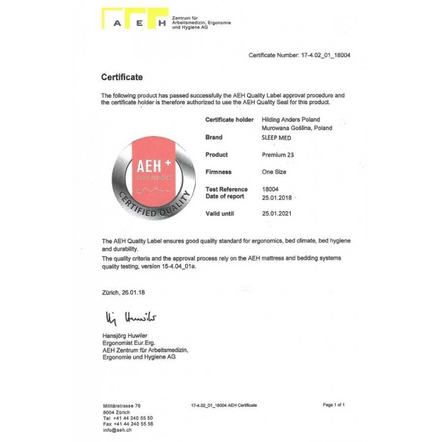 SleepMed Hybrid Premium to nowoczesny materac dedykowany osobom pragnącym pełnej swobody ruchów i komfortu podczas wypoczynku. Model ten posiada znak jakości Szwajcarskiego Instytutu AEH, potwierdzającego wysoką klasę i bezpieczeństwo stosowania produktu. Certyfikat jakości AEH poświadcza, że materac pomyślnie przeszedł wieloaspektowe analizy i testy jakościowe.
